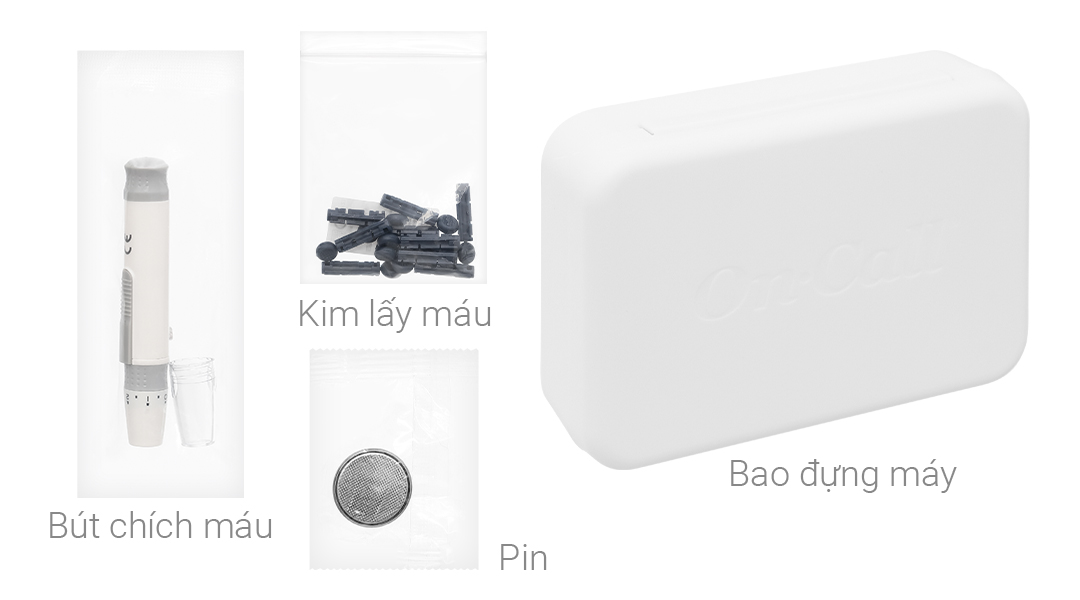 Sản phẩm bao gồmMáy đo đường huyết kèm pin, 10 kim lấy máu, bút lấy máu, bao đựng máy, HDSD