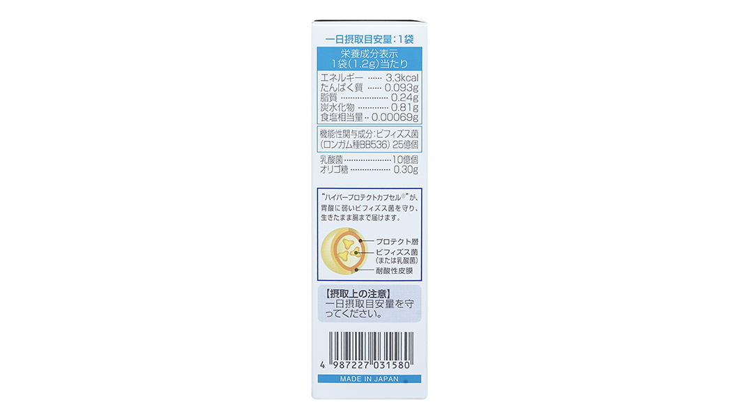 Lợi khuẩn Bifidobacterium: 2,5 tỷ cfu, Lợi khuẩn Lactobacillus: 1 tỷ cfu, Erythritol, chất béo và dầu ăn được, chất xơ oligosaccarit: 0,03g; gelatin; bột gaseri, glycerin, chất nhũ hóa, axit hóa, chất làm dày E440, hương sữa tổng hợp.