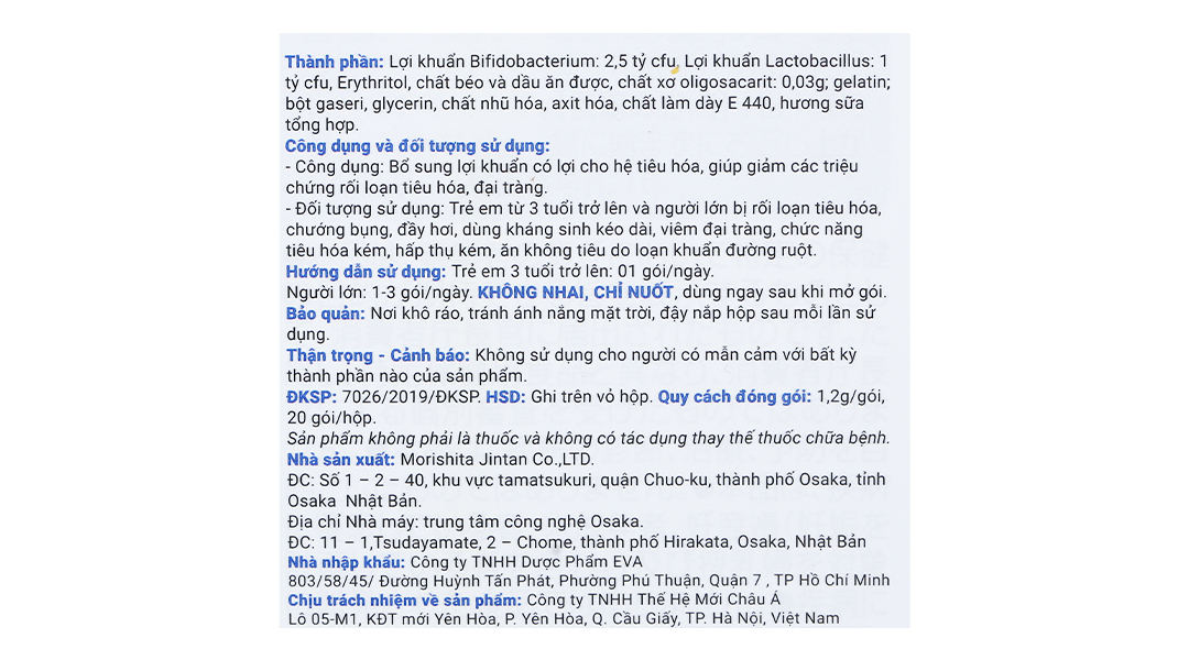 Người lớn: 1-3 gói/ngày. KHÔNG NHAI, CHỈ NUỐT, dùng ngay sau khi mở gói.