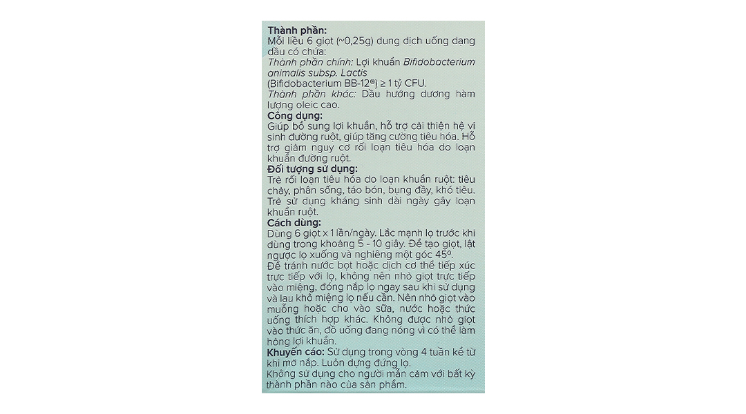 – Thành phần chính: Lợi khuẩn Bifidobacterium animalis subsp. Lactis (Bifidobacterium BB-12) ≥ 1 tỷ CFU.