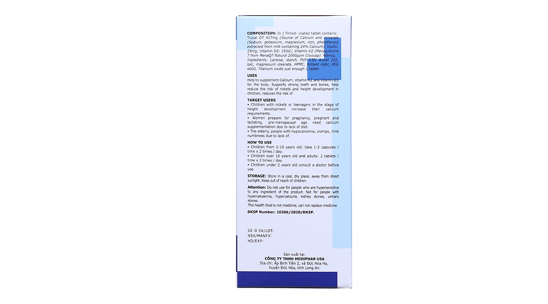 Trucal D7 (Nguồn Canxi và khoáng chất (Natri, kali, magie, sắt, phốt pho) được tách chiết từ sữa chứa 24% Canxi) | 417mg |