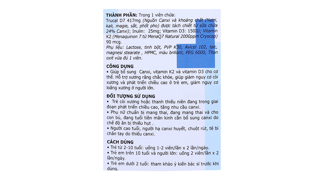 - Trucal D7: TruCal D7 có nguồn gốc hoàn toàn tự nhiên từ sữa, cung cấp các khoáng chất quan trọng cần thiết cho xương gồm: Canxi, Natri, Photpho, Magie, Kali, Sắt với tỷ lệ tương tự như trong xương nên giúp tối ưu hóa lượng dưỡng chất hấp thu vào trong xương, tránh việc thừa hoặc thiếu các khoáng chất có thể gây hại cho cơ thể, đồng thời giúp giảm nguy cơ loãng xương và gãy xương toàn diện hơn, xương chắc khoẻ vượt trội hơn canxi thông thường.