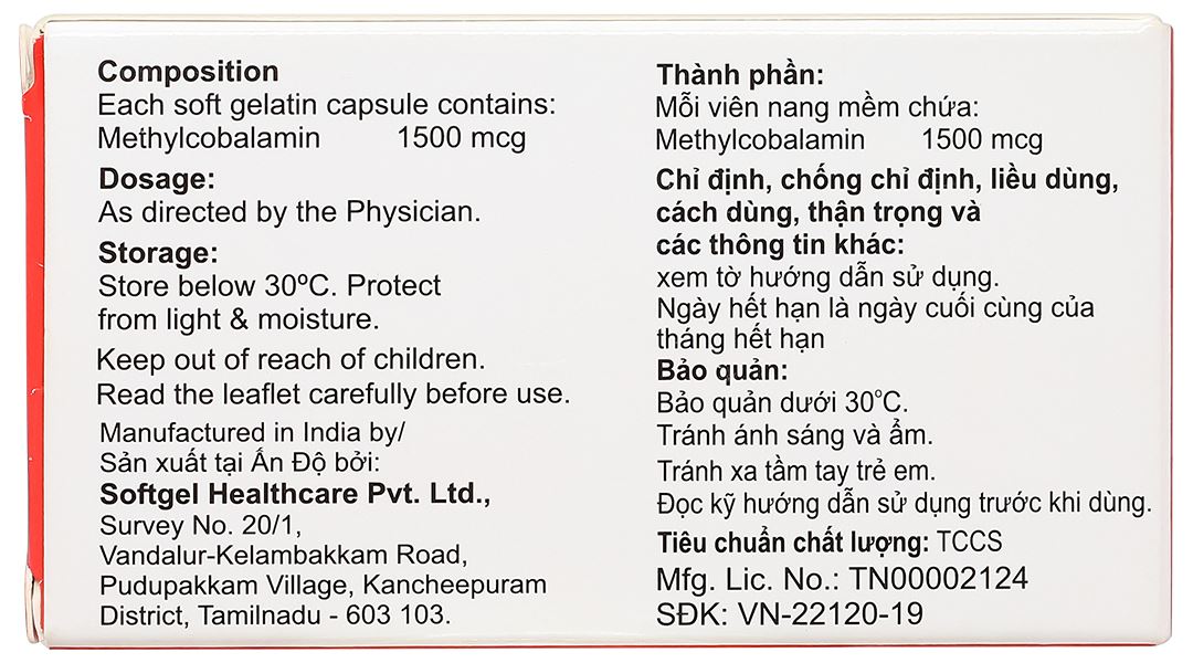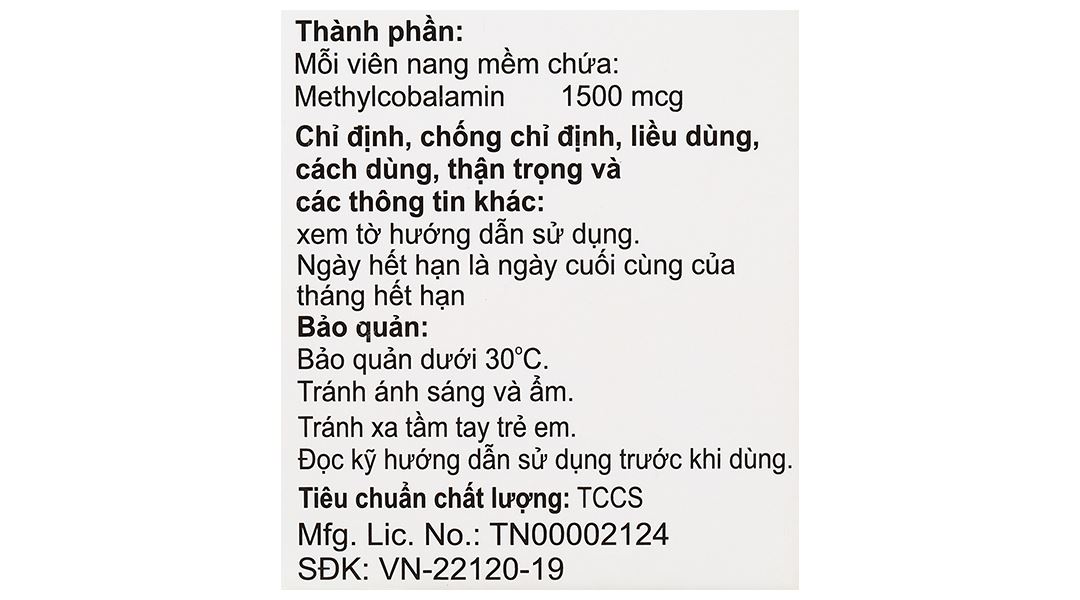 - Thành phần dược chất: Methylcobalamin 1500 mcg.