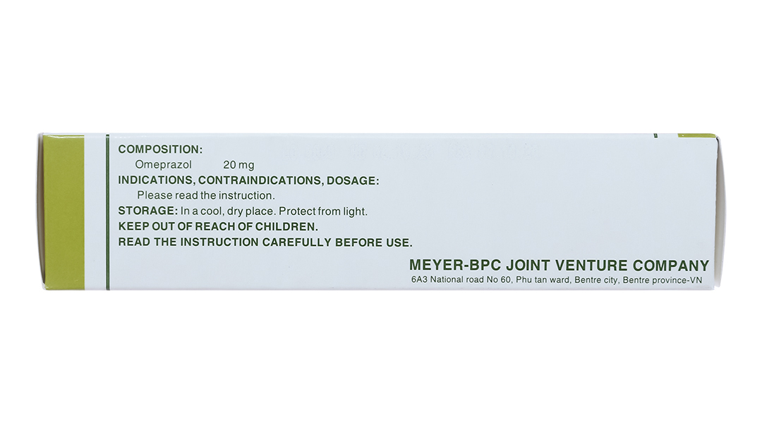 – Omeprazol được hấp thu nhanh chóng ở ruột non sau khi được giải phóng từ hạt bao tan trong ruột và thường hấp thu hoàn toàn sau 3-6 giờ. Omeprazol ở dạng bao tan trong ruột làm tăng sinh khả dụng của thuốc đến trên 65%. Khoảng 95-96% thuốc