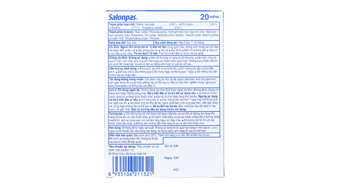 Các phản ứng da như đỏ da, ngứa, phát ban, sưng hoặc phồng rộp có thể xảy ra. Nếu các triệu chứng xảy ra quá mức, ngừng sử dụng Salonpas®. Thông báo cho Bác sĩ hoặc Dược sĩ.