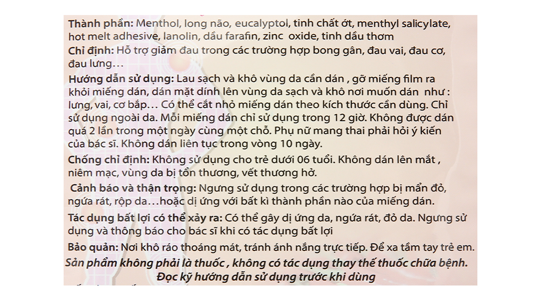 Menthol, long não, eucalyptol, tinh chất ớt, menthyl salicylate, hot melt adhesive, lanolin, dầu farafin, zinc oxide, tinh dầu thơm.