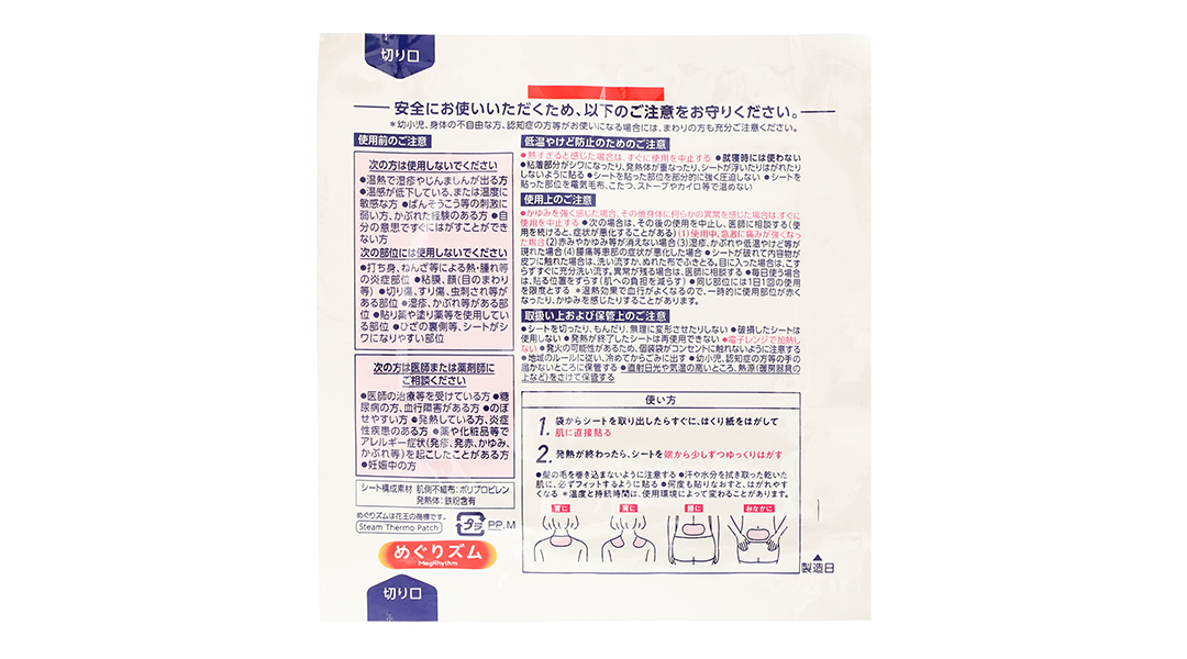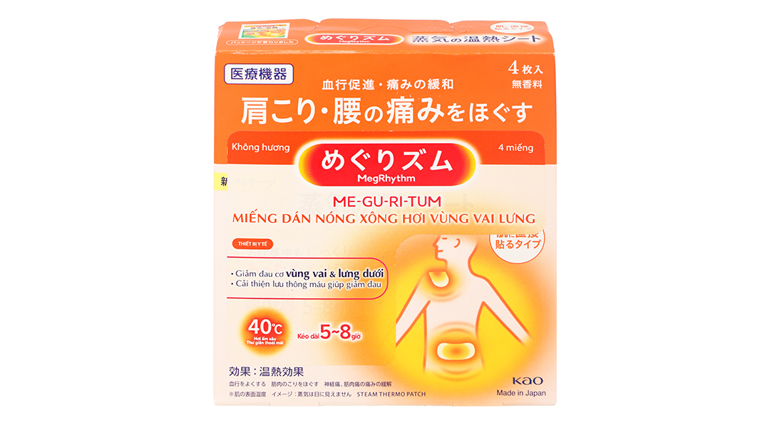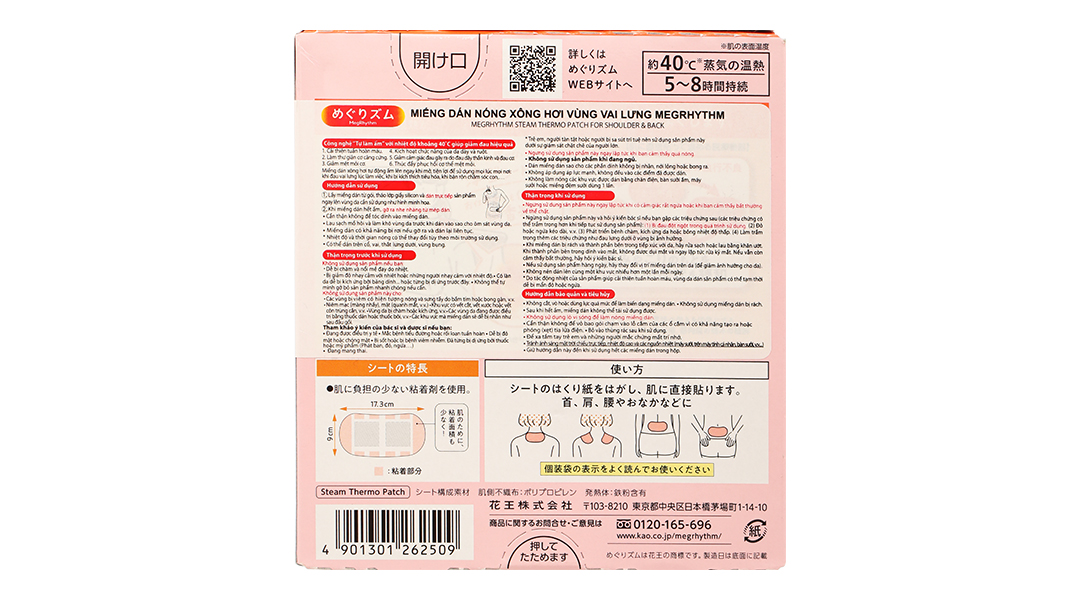 Miếng dán kích thước 17.3 cm x 9cm phù hợp sử dụng cho vùng vai và vùng lưng, có thể dán trực tiếp lên da, không gây thô ráp khó chịu. Sản phẩm có thể làm ấm ~40°C được trên diện tích lớn, tác dụng làm ấm kéo dài giúp vai và lưng bạn thư giãn tức thời cả khi đang giải trí tại nhà, khi xem sách báo, khi chăm sóc da, khi đang làm việc, khi đang đi tàu xe hoặc bất kỳ lúc nào cần thư giãn.
