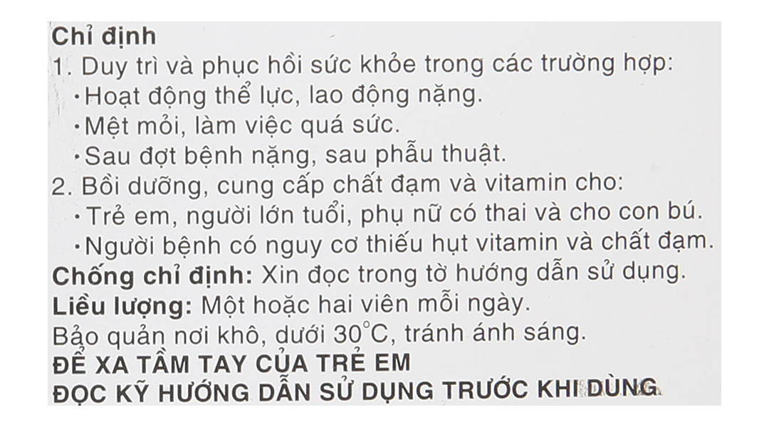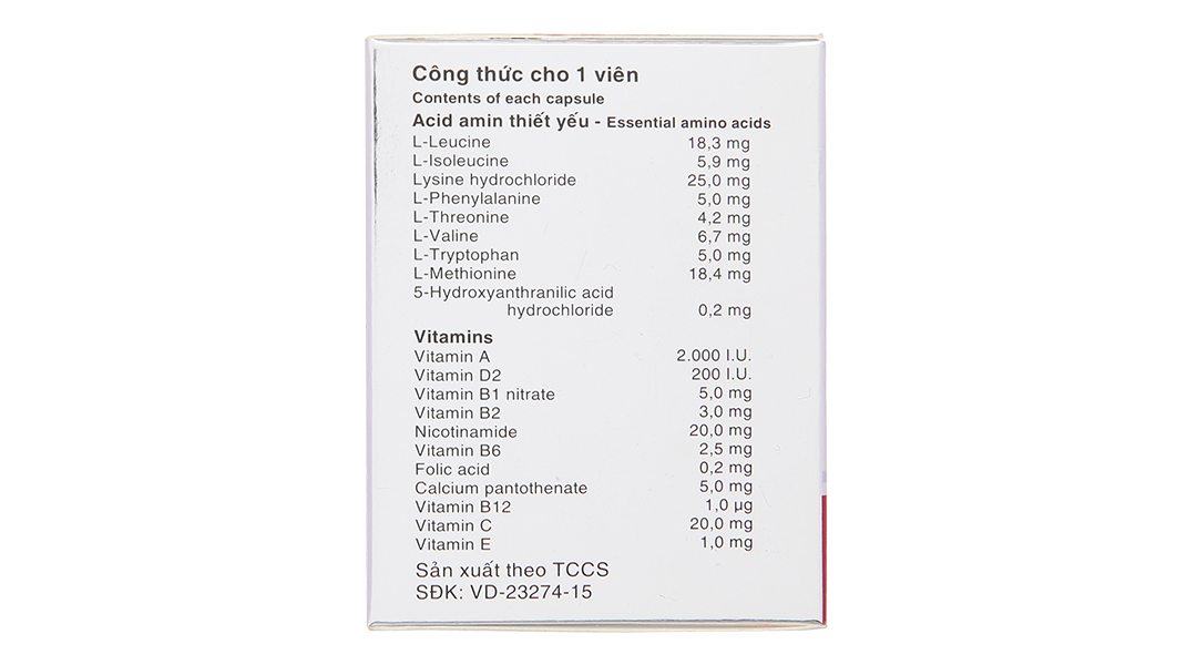 L-Leucin 18,3mg. L-Isoleucin 5,9mg. Lysin hydroclorid 25,0mg. L-Phenylalanin 5,0mg. L-Threonin 4,2mg. L-Valin 6,7mg. L-Tryptophan 5,0mg. L-Methionin 18,4mg. Acid 5-Hydroxyanthranilic hydroclorid 0,2mg. | Vitamin A 2000 I.U. Vitamin D2 200 I.U. Vitamin B1 nitrat 5,0mg. Vitamin B2 3,0mg. Nicotinamid 20mg. Vitamin B6 2,5mg. Acid folic 0,2mg. Calci pantothenat 5,0mg. Vitamin B12 1,0µg. Vitamin C 20,0mg. Vitamin E 1,0mg. |