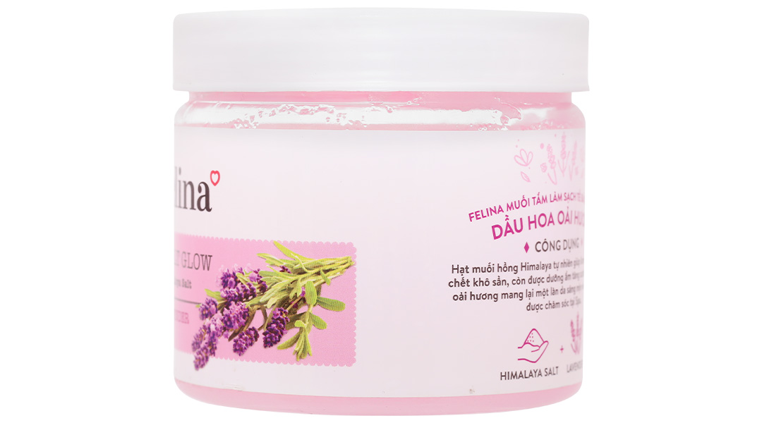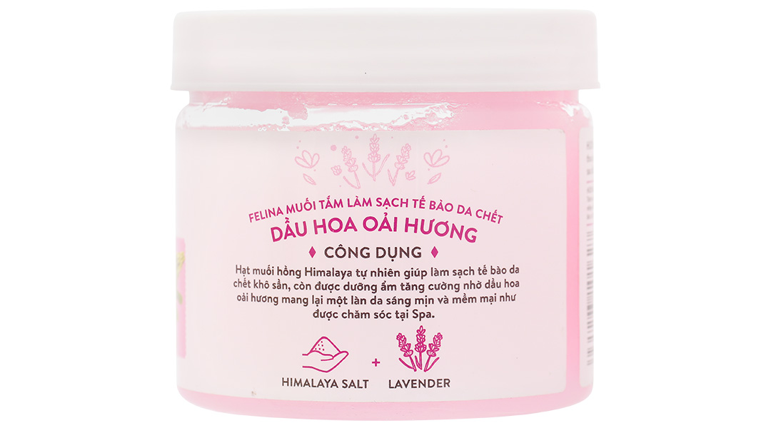 Muối tắm Felina dầu hoa oải hương với thành phần chính là hạt muối hồng Himalaya tự nhiên, những mảng bám trên da sẽ được tẩy sạch sẽ, nhờ đó mà các dưỡng chất cho da sẽ dễ dàng được hấp thụ hơn, nuôi dưỡng da tốt hơn.