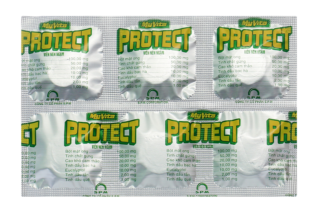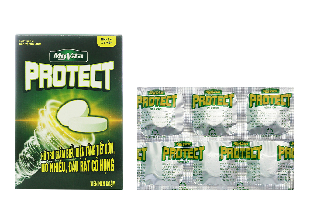 - Viên ngậm MyVita Protect là sản phẩm chăm sóc sức khỏe đường hô hấp, được bào chế từ những thành phần tự nhiên, giúp hỗ trợ giảm các triệu chứng ho, đau rát cổ họng, và khản tiếng một cách hiệu quả. Với công thức kết hợp hoàn hảo từ các nguyên liệu thiên nhiên như bột mật ong, tinh chất gừng, cao khô cam thảo, tinh dầu bạc hà, eucalyptol, tinh dầu tần và tinh dầu quế, MyVita Protect mang lại nhiều lợi ích cho sức khỏe của hệ hô hấp.