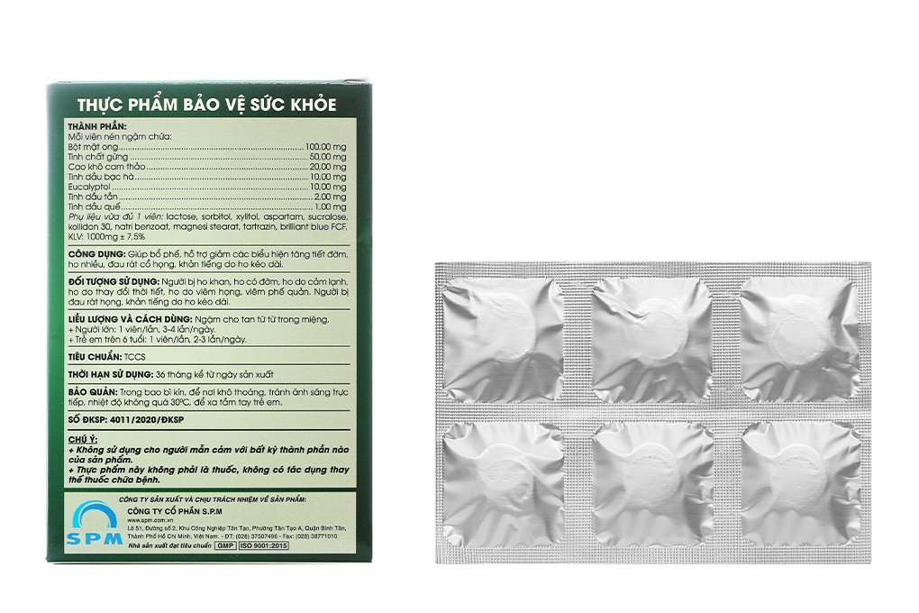 - Thành phần bột mật ong có tác dụng làm dịu cổ họng, giúp giảm đau rát, trong khi tinh chất gừng và cao khô cam thảo hỗ trợ làm ấm cơ thể, chống viêm và kháng khuẩn. Tinh dầu bạc hà, eucalyptol và tinh dầu tần có tác dụng làm mát, giúp thông thoáng đường thở, giảm ho và cải thiện tình trạng khản tiếng.
