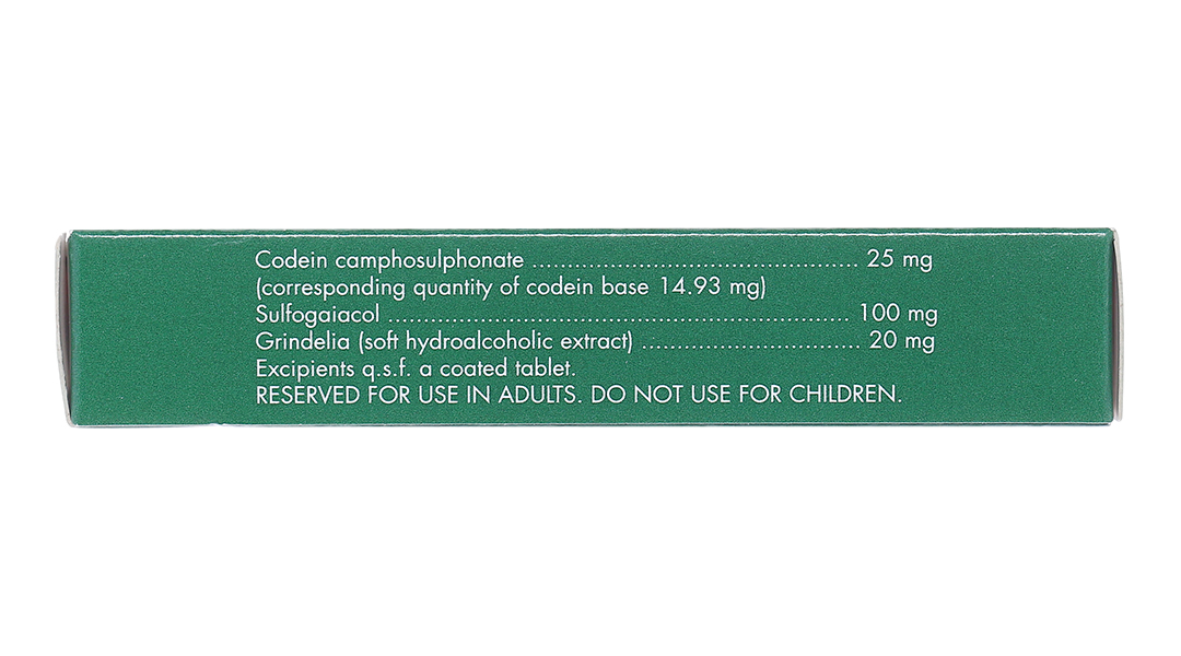 Codein camphosulphonat: 25mg (tương đương 14.93mg codein base), sulfogaiacol (INN): 100mg, cao mềm Grindelia: 20mg.