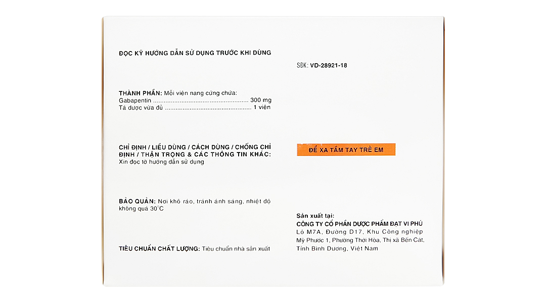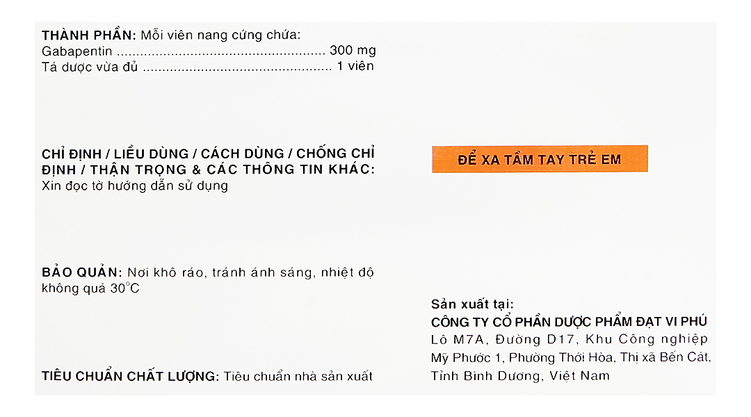 - Thành phần dược chất: Gabapentin 300mg.
