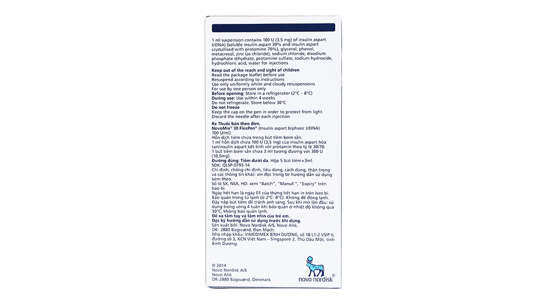 – Thận trọng khi sử dụngĐọc kỹ hướng dẫn sư dụng trước khi sử dụng. Nếu cần thêm thông tin, xin hỏi ý kiến bác sĩ. Thuốc này chỉ sử dụng theo kê đơn của bác sĩ. Trước khi di chuyển tới các vùng địa lý khác nhau, bệnh nhân nên tham khảo tư vấn của bác sĩ vì điều nay có nghĩa là bệnh nhân sử dụng insulin vào các bữa ăn ở các thời điểm khác nhau. Tăng đường huyết (đường trong máu cao) Điều trị không đủ liều hoặc không liên tục, đặc biệt ở bệnh nhân đái tháo đường tip 1, có thể dẫn đến tăng đường huyết và nhiễm toan ceton do đái tháo đường. Thông thường triệu chứng đầu tiên của tăng đường huyết xuất hiện dần dần trong khoảng thời gian vài giờ hoặc vài ngày. Các triệu chứng bao gồm khát, tăng tần số đì tiểu, buồn nôn, nôn, buồn ngủ, khô da, khô miệng, chán ăn và hơi thở có mùi ceton. Ở bệnh nhân đái tháo đường típ 1, tăng đường huyết không được điều trị có thể dẫn đến nhiễm toan ceton do bệnh đái tháo đường gây ra tử vong. Hạ đường huyết (đường trong máu thấp) Quên một bữa ăn hay tập luyện thể lực căng thẳng, không có kế hoạch có thể dẫn đến hạ đường huyết. Hạ đường huyết có thể xảy ra nếu sử dụng liều insulin cao quá so với nhu cầu insulin. (Xem mục Tác dụng không mong muốn và Quá liều). So với insulin người 2 pha (hỗn hợp/trộn sẵn), NovoMix 30 có thể có tác dụng hạ đường huyết mạnh cao hơn lên đến 6 giờ sau khi tiêm. Điều này có thể phải được điều chỉnh đối với từng cá thể của bệnh nhân qua việc điều chỉnh liều insulin và/ hoặc lượng thức ăn đưa vào. Những bệnh nhân có sự kiểm soát đường huyết được cải thiện rất nhiều, ví dụ do liệu pháp insulin tích cực, có thể xảy ra thay đổi các triệu chứng báo trước thường là hạ đường huyết và nên được bác sĩ tư vấn. Những triệu chứng cảnh báo thường có thể tự mất đi ở những bệnh nhân đái tháo đường lâu năm. Kiểm soát: chặt chẽ mức đường huyết có thể làm tăng các cơn hạ đường huyết và do đó đòi hỏi sự chú ý đặc biệt trong quá trình tăng liều như được nêu trong mục liều sử dụng. NovoMix 30 nên được sử dụng ngay liên quan với bữa ăn, do đó khởi phát tác dụng nhanh phải được xem xet ở những bệnh nhân có bệnh lý đì kèm hoặc đang uống kèm thuốc có tác dụng làm chậm hấp thu thức ăn. Các bệnh lý đi kèm, đặc biệt tình trạng nhiễm trùng, sốt, thường làm tăng nhu cầu insulin của bệnh nhân. Trường hợp có bệnh thận, gan hoặc liên quan đến thượng thận, tuyến yên, tuyến giáp đí kèm có thể yêu cầu thay đổi liều insulin. Khi bệnh nhân được chuyển đổi giữa các loại insulin khác nhau, các triệu chứng báo hiệu sớm của hạ đường huyết có thể thay đổi hoặc ít xảy ra hơn so với loại insulin sử dụng trước đó Chuyển đổi từ các chế phẩm insulin khác Bệnh nhân chuyển sang sử dụng loại insulin hay nhãn hiệu insulin mới cần được thực hiện dưới sự theo dõi chặt chẽ của nhân viên y tế. Những thay đổi về hàm lượng, nhãn hiệu (nhà sản xuất), loại, chủng loại (insulin người, chế pham insulin analogue và/hoặc qui trình sản xuất có thể dẫn đến sự cần thiết thay đổi liều sử dụng. Bệnh nhân chuyển sang sử dụng NovoMix 30 từ loại insulin khác có thể yêu cầu tăng số lần tiêm/ngày hoặc thay đổi liều sử dụng so với insulin được sử dụng trước đó. Nếu việc điều chỉnh là cần thiết thì có thể thực hiện ở liều đầu tiên hoặc trong vài tuần hoặc vài tháng đầu. Phản ứng tại vị trí tiêm Cũng như bất kể liệu pháp insulin nào, phản ứng tại vị trí tiêm có thể xảy ra bao gồm đau, đỏ, nổi mề đay, viêm, bầm tím, sưng và ngứa. Liên tục thay đổi vị trí tiêm trong 1 khu vực nhất định sẽ giúp làm giảm nguy cơ xuất hiện những phản ứng này. Những phản ứng này biến mất trong vài ngày đến vài tuần. Trường hợp hiến gặp, phản ứng tại vị trí tiêm có thể cần ngưng sử dụng NovoMix 30. Kết hợp thiazolidinediones với các chế phẩm insulin Các trường hợp suy tim sung huyết đã được báo cáo khi sử dụng kết hợp thiazolidinedion với insulin, đặc biệt ở bệnh nhân có các yếu tố nguy cơ gây suy tim sung huyết. Điều này nên được lưu ý khi dùng kết hợp thiazolidinediones với các thuốc insulin. Nếu sử dụng kết hợp, bệnh nhân nên được quan sát các dấu hiệu và triệu chứng của suy tim sung huyết, phù và tăng cân. Thiazolidinediones nên được ngưng sử dụng khi xảy ra bất kỳ các triệu chứng của suy tim. Kháng thể kháng Insulin Điều trị bằng insulin có thể xuất hiện kháng thể kháng insulin. Trường hợp hiếm gặp, sự hiện diện của kháng thể kháng insulin có thể cần phải điều chỉnh liều insulin chính xác để tránh tăng hay hạ đường huyết. Khi đang sử dụng hạn dùng là 4 tuần (ở nhiệt độ dưới 30°C). – Thai kỳ và cho con búÍt có nghiên cứu lâm sàng về việc sử dụng NovoMix 30 trong thời kỳ mang thai.