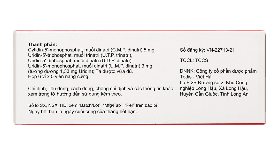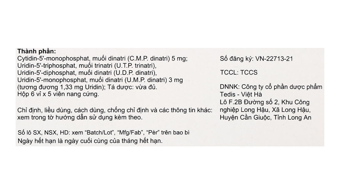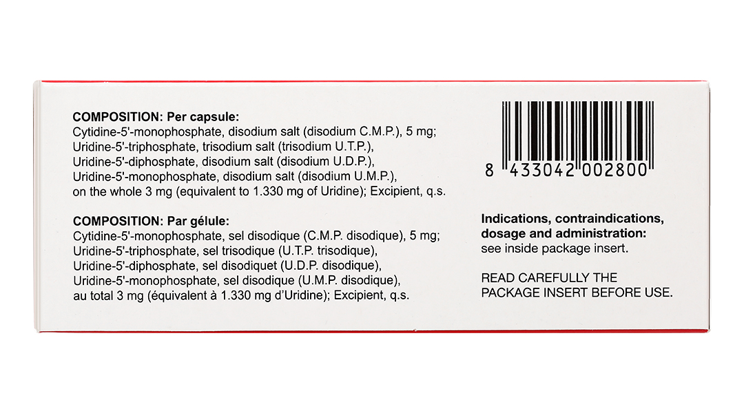 Uridin-5′-triphosphat, muối trinatri (U.T.P. trinatri); Uridin-5′-diphosphat, muối dinatri (U.D.P. dinatri); Uridin-5’-monophosphat, muối dinatri (U.M.P. dinatri) 3mg (Tương đương 1,33 mg Uridin).