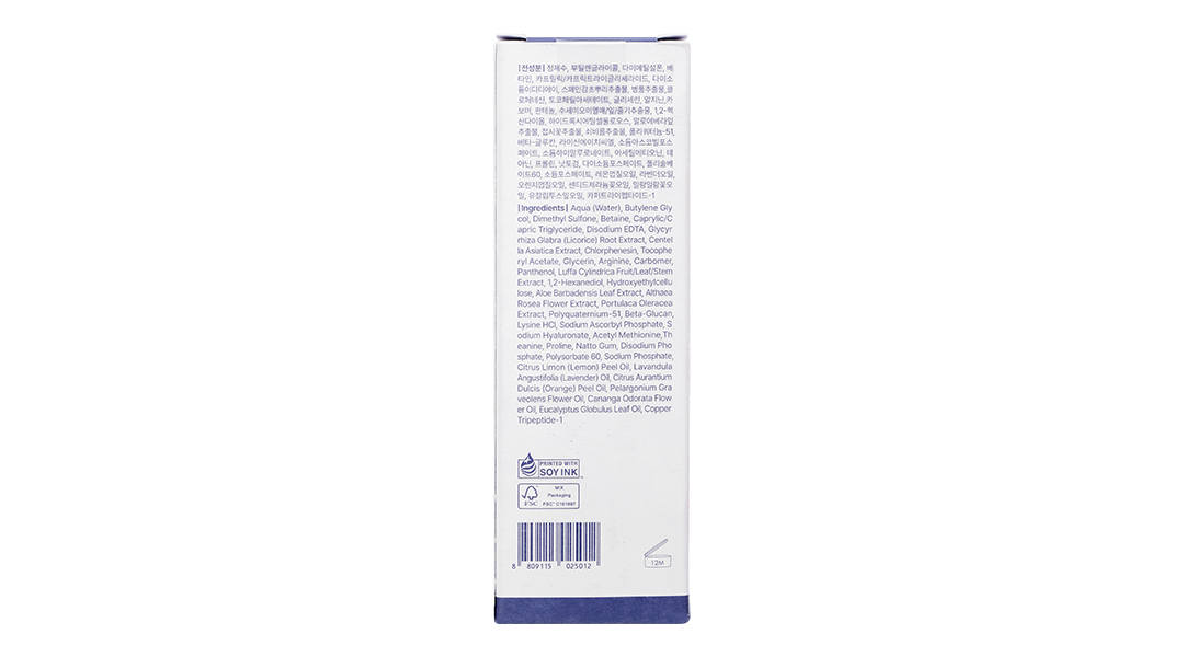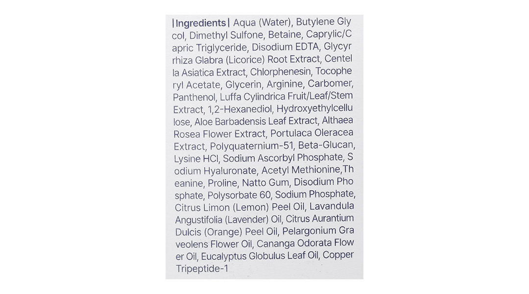 Thành phần chi tiết: Aqua (Water), Butylene Glycol, Dimethyl Sulfone, Betaine, Caprylic/Capric Triglyceride, Disodium EDTA, Glycyrrhiza Glabra (Licorice) Root Extract, Centella Asiatica Extract, Chlorphenesin, Tocopheryl Acetate, Glycerin, Arginine, Carbomer, Panthenol, Luffa Cylindrica Fruit/Leaf/Stem Extract, 1,2-Hexanediol, Hydroxyethylcellulose, Aloe Barbadensis Leaf Extract, Althaea Rosea Flower Extract, Portulaca Oleracea Extract, Polyquaternium-51, Beta-Glucan, Lysine HCI, Sodium Ascorbyl Phosphate, Sodium Hyaluronate, Acetyl Methionine, Theanine, Proline, Natto Gum, Disodium Phosphate, Polysorbate 60, Sodium Phosphate, Citrus Limon (Lemon) Peel Oil, Lavandula Angustifolia (Lavender) Oil, Citrus Aurantium Dulcis (Orange) Peel Oil, Pelargonium Graveolens Flower Oil, Cananga Odorata Flower Oil, Eucalyptus Globulus Leaf Oil, Copper Tripeptide-1.