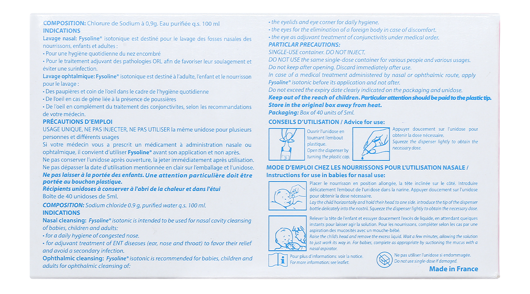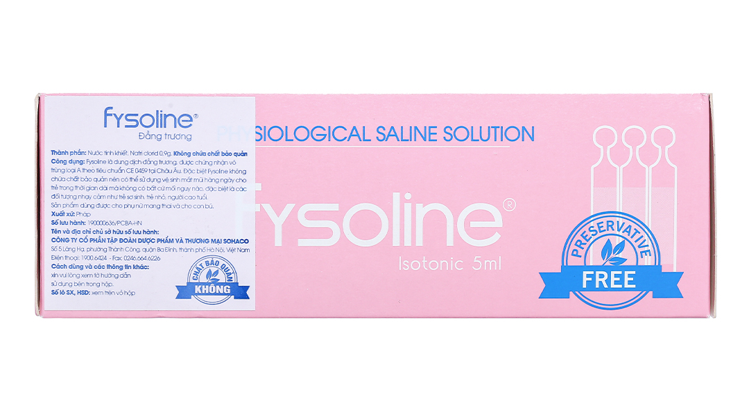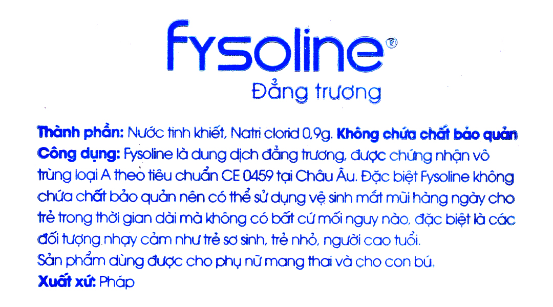 Fysoline là dung dung dịch đẳng trương, được chứng nhận vô trùng loại A theo tiêu chuẩn CE tại Châu Âu. Đặc biệt Fysoline không chứa chất bảo quản nên có thể sử dụng vệ sinh mắt mũi hàng ngày cho trẻ trong thời gian dài.