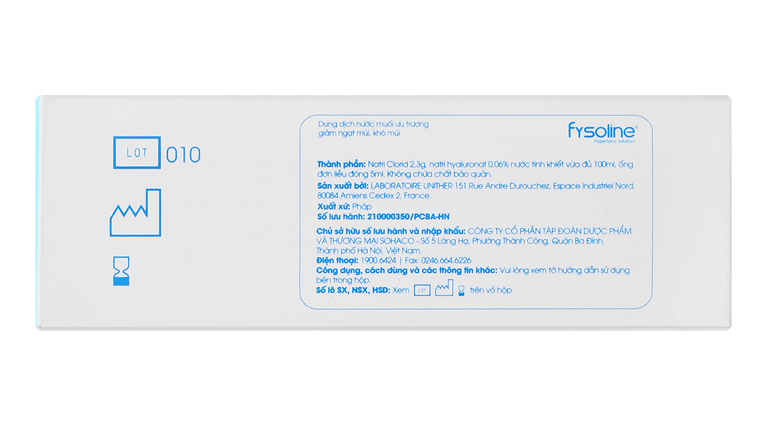 - Fysoline Hypertonic solution là dung dịch nước muối ưu trương, được chứng nhận vô trùng loại A theo tiêu chuẩn CE tại châu Âu.