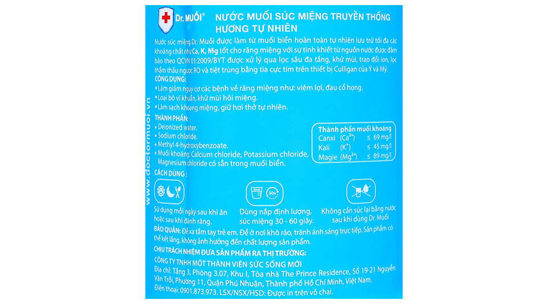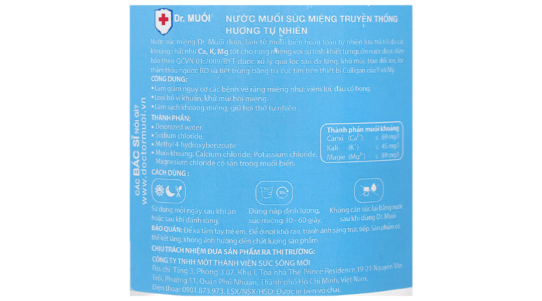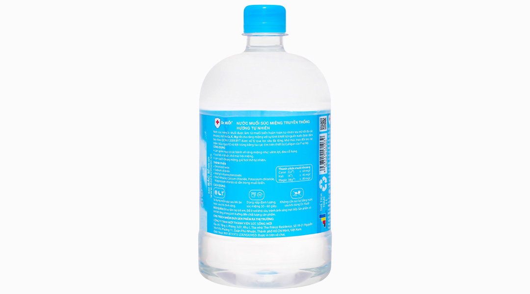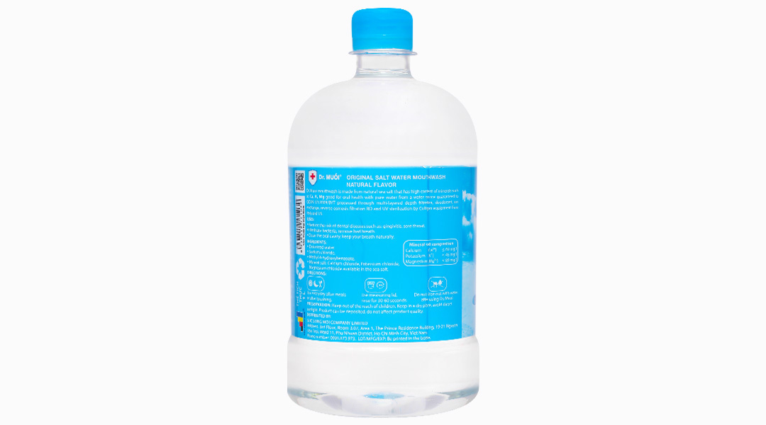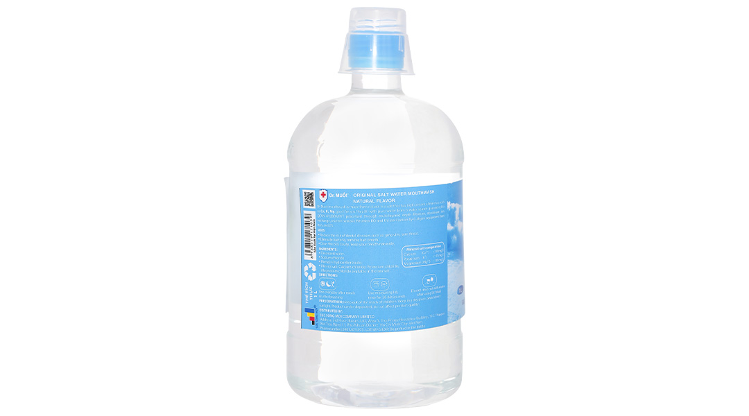 Nước súc miệng Dr. Muối 1000ml được làm từ 100% muối biển tự nhiên có sẵn khoáng chất như: Ca, K, Mg tốt cho răng miệng với sự tinh khiết của nước từ các mạch nước ngầm rất sâu đã được xử lý qua lọc sâu đa tầng, khử mùi, trao đổi ion, lọc thẩm thấu ngược và tiệt trùng bằng tia cực tím trên thiết bị Culligan của Ý và Mỹ.