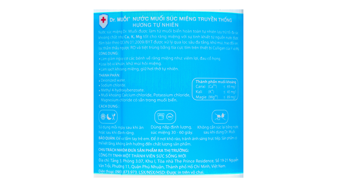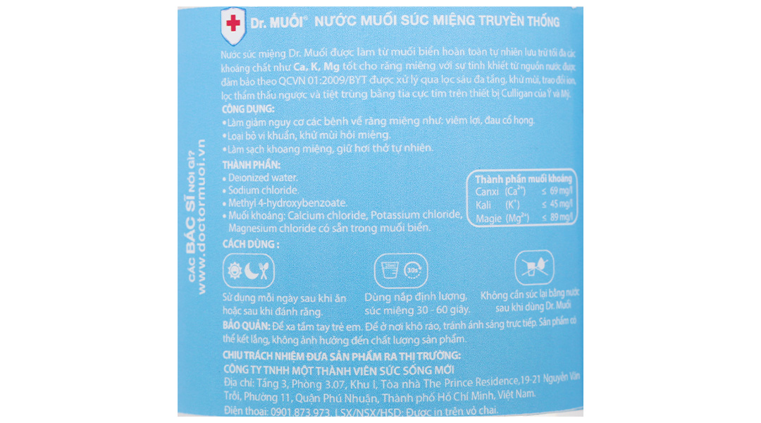 Nước súc miệng Dr. Muối có chứa các khoáng chất như: Ca, K, Mg tốt cho răng miệng; có khả năng loại bỏ vi khuẩn gây mùi hôi và tạo cảm giác sảng khoái cho người dùng. Ngoài ra, nước súc miệng Dr. Muối khác biệt hơn các loại nước súc miệng, xịt thơm miệng khác là sản phẩm này không chứa cồn giúp tránh khô miệng và tạo cảm giác thoải mái cho người dùng.