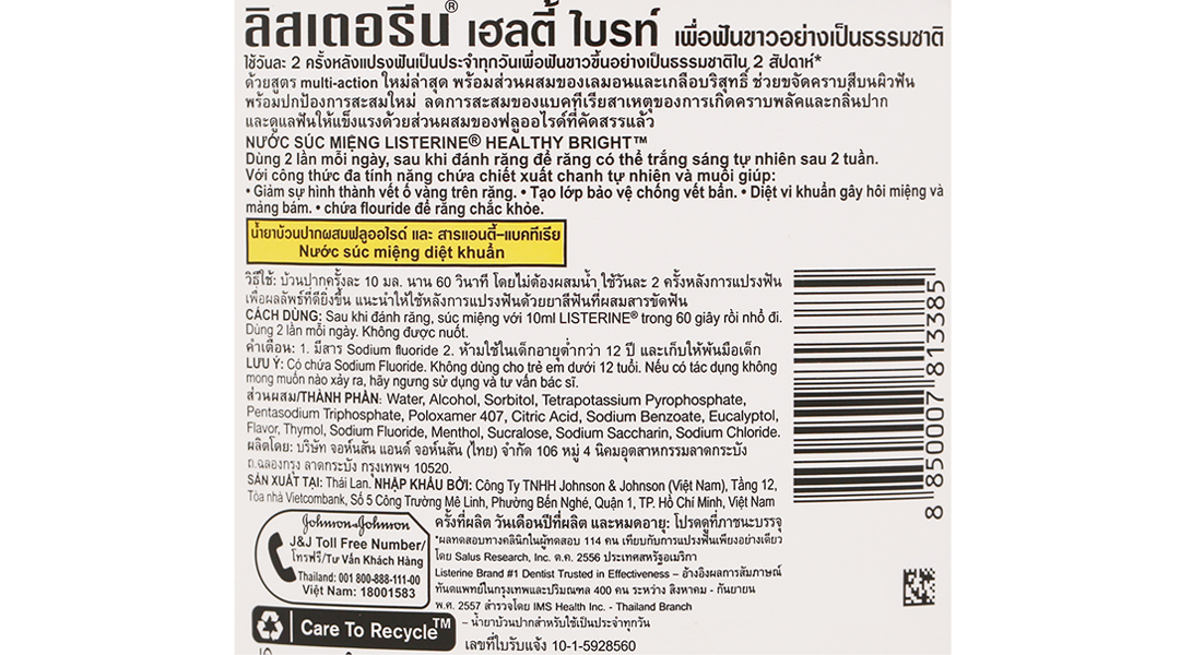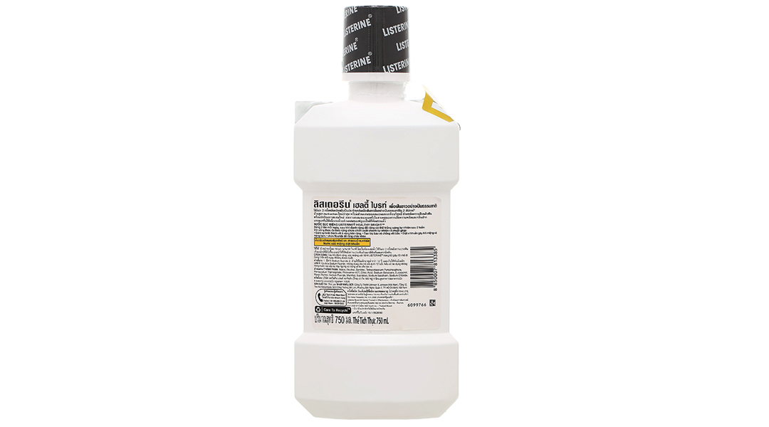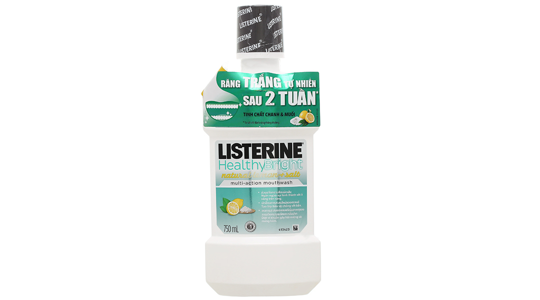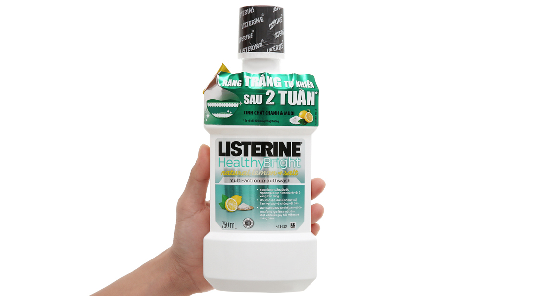 Dùng nước súc miệng Listerine 2 lần mỗi ngày, sau khi đánh răng để răng có thể trắng sáng tự nhiên sau 2 tuần. Với công thức đa tính năng chứa chiết xuất chanh tự nhiên và muối giúp: Giảm sự hình thành vết ố vàng trên răng, tạo lớp bảo vệ chống vết bẩn, diệt vi khuẩn gây hôi miệng và mảng bám, chứa Fluoride để răng chắc khỏe.