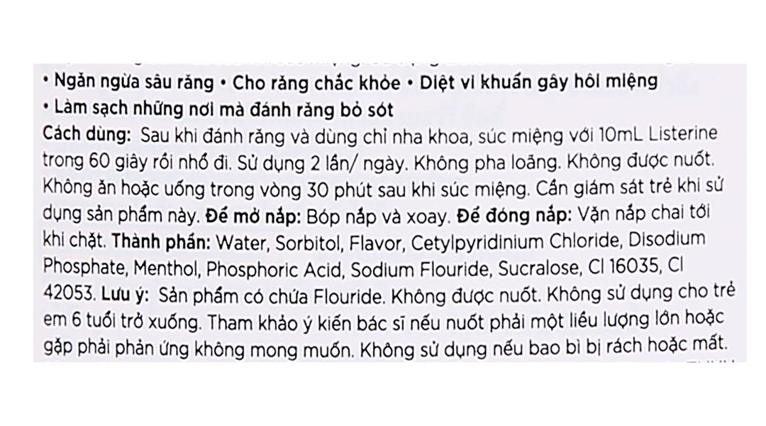 Thành phầnWater, Sorbitol, Flavor, Cetylpyridinium Chloride, Disodium Phosphate, Menthol, Phosphoric Acid, Sodium Fluoride, Sucralose, Cl 16035, Cl 42053