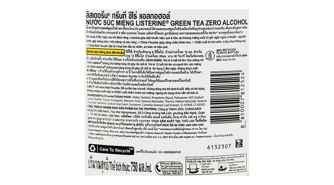 Nước súc miệng Listerine được sản xuất tại Thái Lan. Nước súc miệng giúp làm sạch khoang miệng hiệu quả, chăm sóc nướu và mang lại hơi thở thơm ngát tự nhiên. Nước súc miệng ngừa sâu răng Listerine trà xanh 750ml hương thơm dễ chịu cho khoang miệng.
