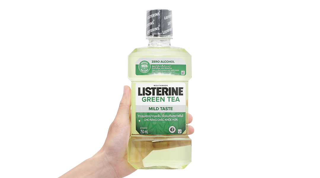 Nước súc miệng Listerine Trà Xanh chứa Fluoride giúp răng chắc khoẻ và ngăn ngừa sâu răng.