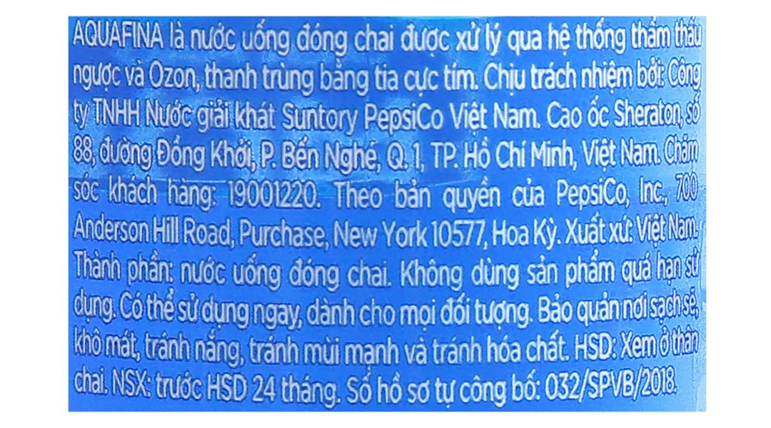 Nước tinh khiết, nước suối Aquafina có độ pH ~ 7, chỉ số TDS <50mg/l chuẩn theo quy định nước uống của Việt Nam. H2 và O2 là thành phần chính trong nước uống và không có bất kỳ khoáng, vi khuẩn và các tạp chất nào khác. Nước uống được sản xuất theo tiêu chuẩn của Mỹ, Aquafina mang đến sự đảm bảo tuyệt đối về chất lượng cho người tiêu dùng.