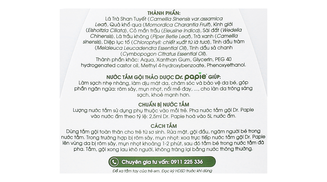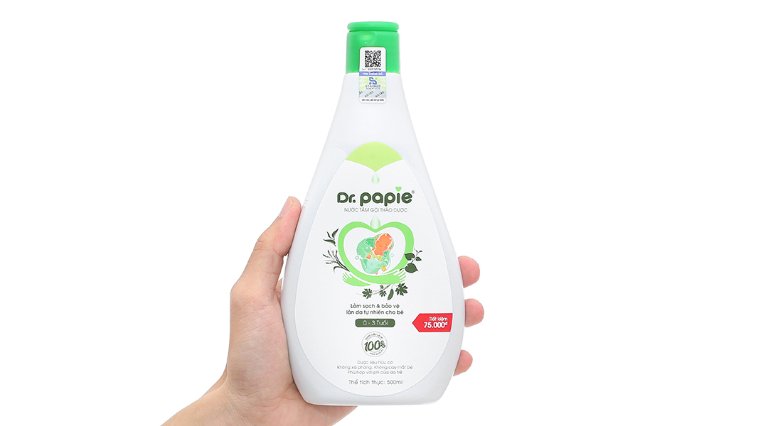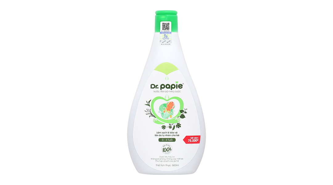 Nước tắm gội thảo dược Dr.Papie với 100% thành phần từ thiên nhiên, chăm sóc da bé dịu nhẹ, an toàn, phòng ngừa rôm sảy, mẩn ngứa.