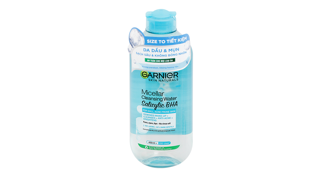 Tẩy trang Micellar Salicylic BHA làm sạch lớp make-up, bụi bẩn, làm giảm, ngừa mụn & làm sáng mịn da. Lần đầu tiên Garnier kết hợp công nghệ Micellar với Salicylic BHA & dẫn xuất Vitamin C phù hợp cho da dầu mụn. Công nghệ Micelles lấy sạch bụi bẩn, Salicylic BHA giúp ngừa mụn & dẫn xuất Vitamin C giúp làm sáng da, đều màu và giảm vết thâm.