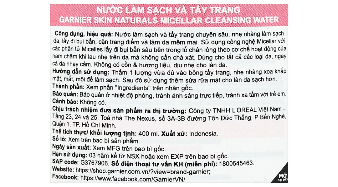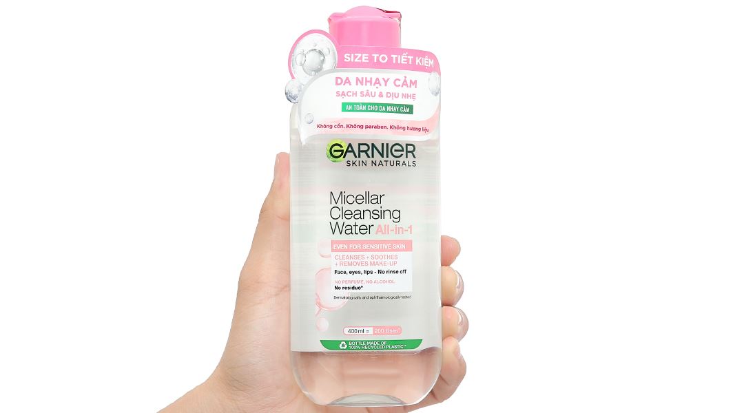 Nước Làm Sạch Và Tẩy Trang Cho Da Nhạy Cảm Micellar Water GARNIER 400ML là dòng sản phẩm nước làm sạch và tẩy trang đa năng được thiết kế chuyên biệt dành cho làn da nhạy cảm, giúp làm sạch hiệu quả mà không gây tổn hại cho làn da của bạn. Sản phẩm chăm sóc da 3 trong 1 này có thể được sử dụng như một sản phẩm làm sạch, toner hoặc tẩy trang – với công nghệ Micelles chứa các hạt phân tử micelles giúp loại bỏ bụi bẩn, dầu thừa và lớp trang điểm theo cơ chế hoạt động của nam châm mà không cần chà xát mạnh, không cần rửa lại với nước.