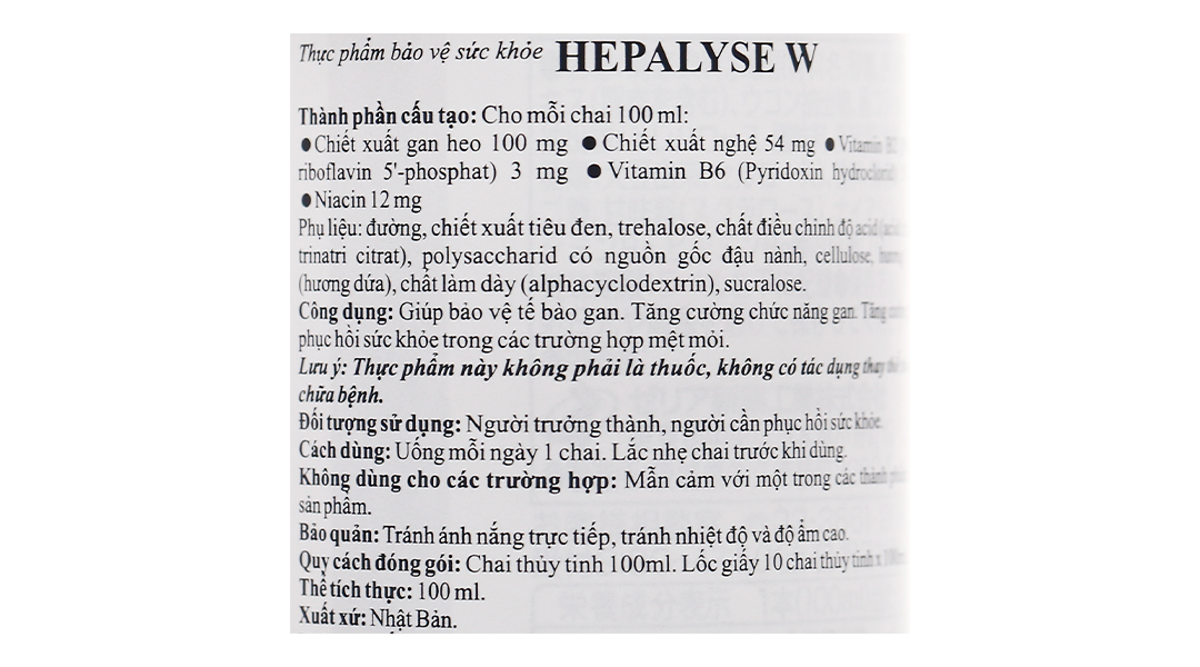 - Hepalyse W 100ml là một sản phẩm giúp bảo vệ và tăng cường chức năng gan, giúp phục hồi sức khỏe hiệu quả. Thành phần chính của sản phẩm bao gồm chiết xuất gan heo, nghệ, và các vitamin nhóm B (B2, B6, Niacin) giúp tối ưu hóa chức năng gan, từ đó hỗ trợ quá trình thải độc, chuyển hóa chất dinh dưỡng và duy trì các hoạt động sinh lý quan trọng của cơ thể.