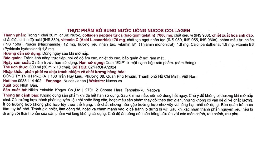 Hoạt chấtCollagen peptide (từ cá), Vitamin B1 (Thiamin mononitrat), Niacin (Niacinamide), Vitamin B6 (Pyridoxin hydroclorid), Vitamin C (Acid L-ascorbic), Calci pantothenat