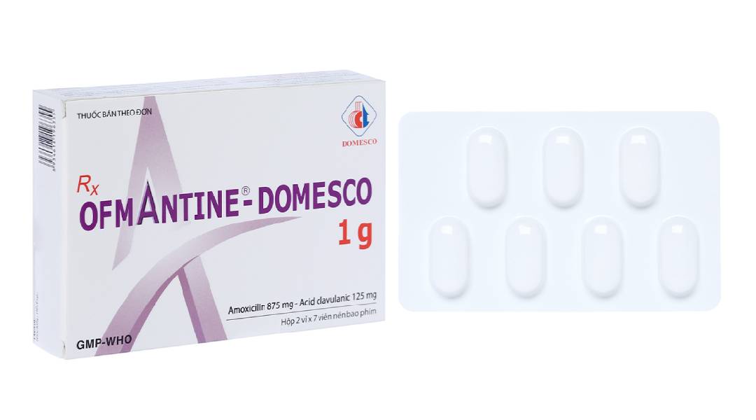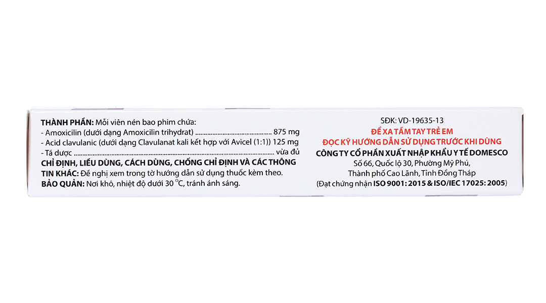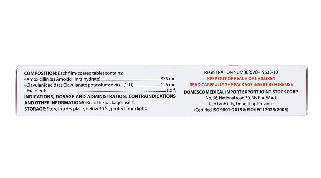 – Amoxicilin (dưới dạng Amoxicilin trihydrat) 875mg, Acid Clavulanic (dưới dạng Clavulanat kali kết hợp với Avicel (1:1)) 125 mg