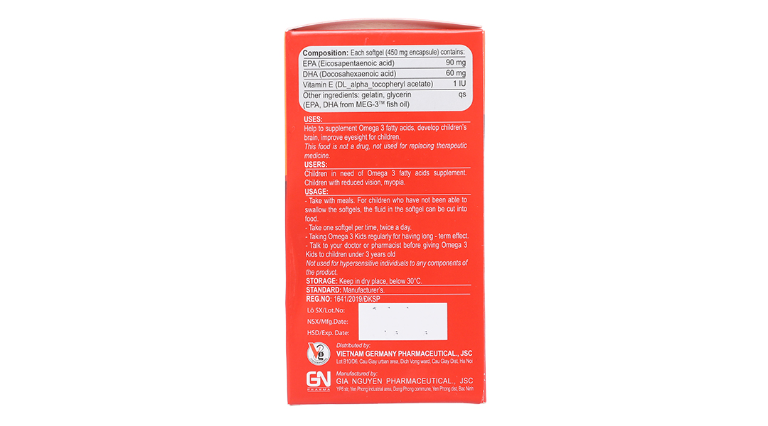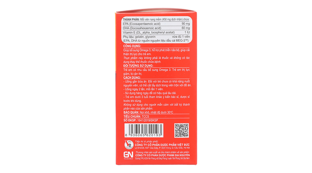 Hoạt chấtVitamin E (DL_alpha_tocopheryl acetat), EPA (Eicosapentaenoic acid), DHA (Docosahexaenoic axit)