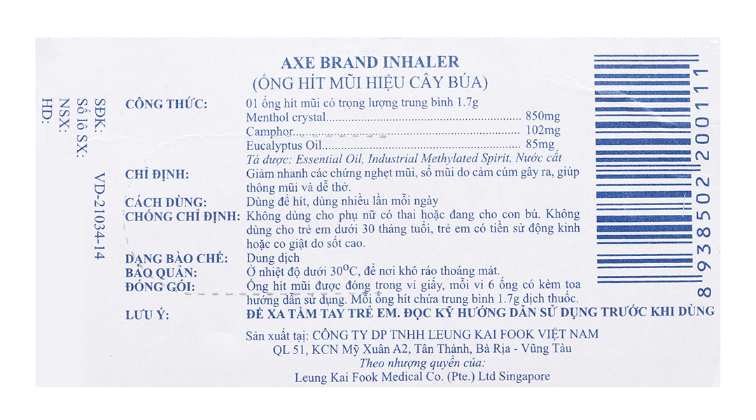 Ống hít mũi hiệu Cây Búa (Axe Brand Inhaler) với mùi thơm mát của Bạc hà, Long Não và tinh dầu Khuynh diệp giúp giảm các triệu chứng nghẹt mũi, sổ mũi một cách hiệu quả; nhanh chóng giúp thông mũi và dễ thở.