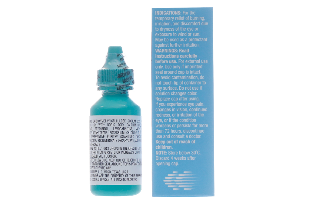 - Optive chứa chất bảo quản Purite duy nhất, dịu và không gây kích ứng mà khi nhỏ vào mắt thì chất này sẽ biến đổi cuối cùng thành những thành phần của nước mắt tự nhiên (natri clorid và nước).
