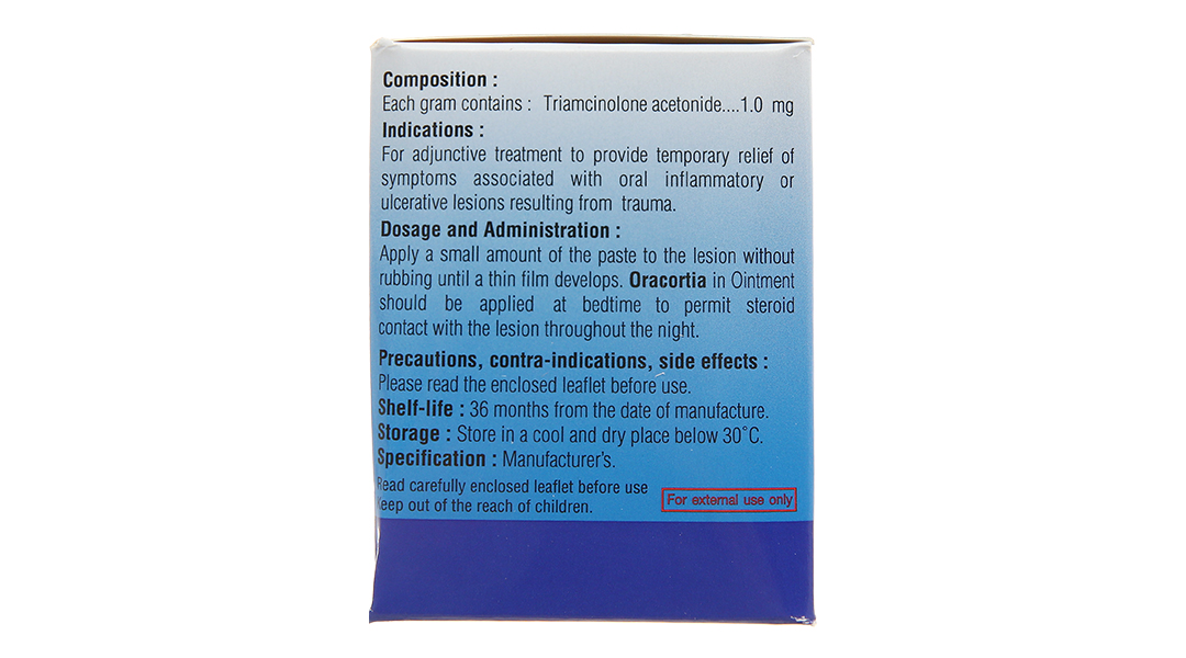 ORACORTIA được chỉ định điều trị hỗ trợ để làm giảm tạm thời các triệu chứng của viêm nhiễm khoang miệng hay tổn thương dạng loét do chấn thương.