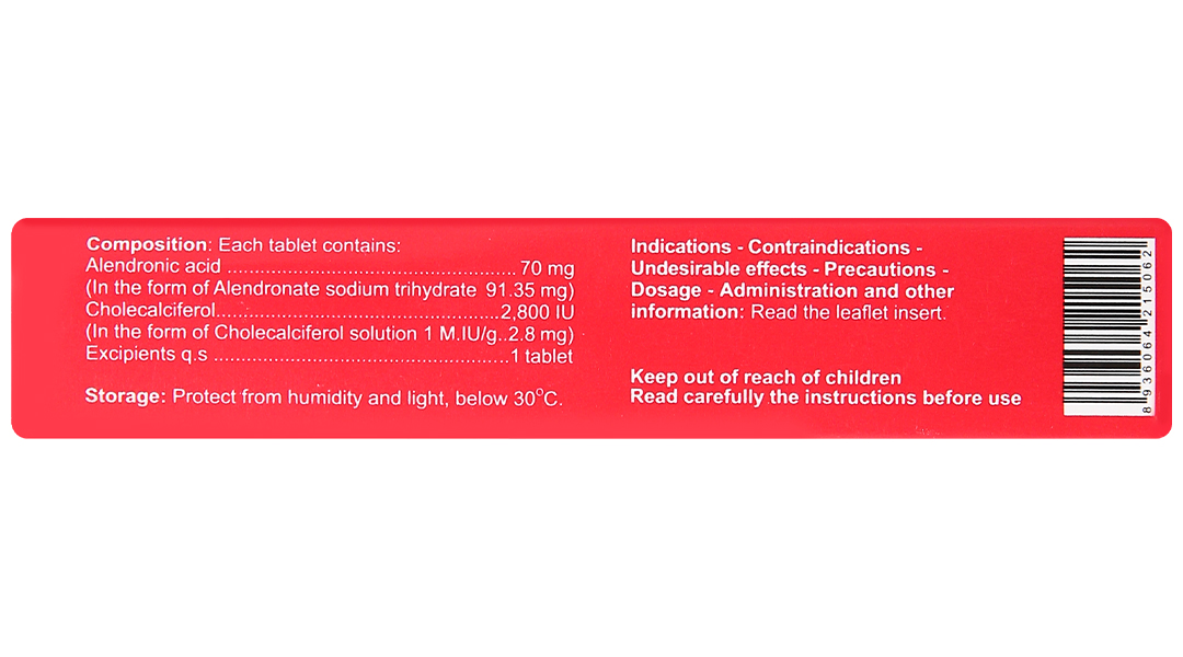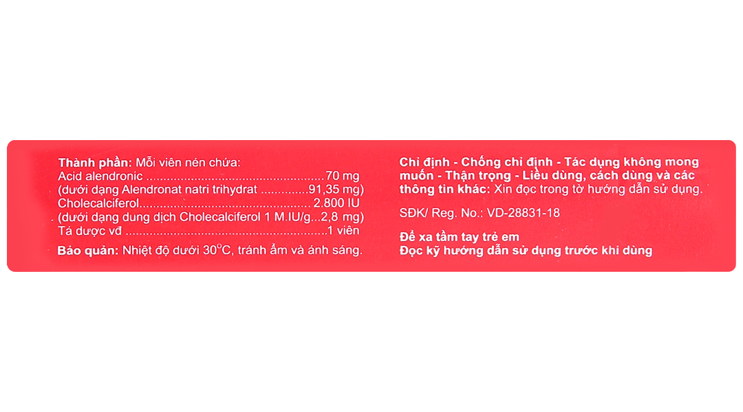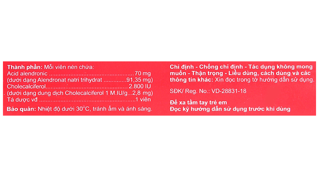 - Acid alendronic 70 mg (dưới dạng Alendronat natri trihydrat: 91,35 mg).