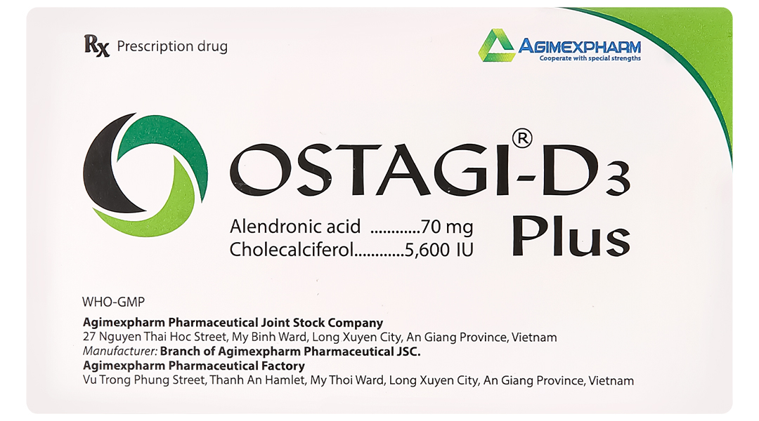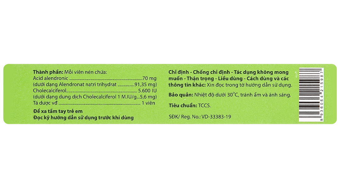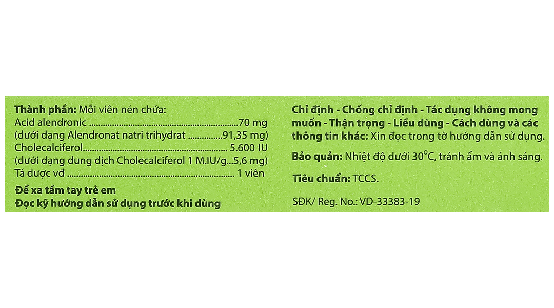 – Thai kỳ và cho con búThuốc này được chỉ định dùng cho phụ nữ mãn kinh, không dùng cho phụ nữ có thai và phụ nữ đang cho con bú. – Khả năng lái xe và vận hành máy mócChưa có bằng chứng về ảnh hưởng của thuốc lên khả năng lái xe, vận hành máy móc nhưng nên thận trọng vì đã có báo cáo tác dụng phụ tuy hiếm gặp là ảo thính giác, rối loạn thị giác. – Tương tác thuốcTương tác: Liên quan đến alendronat: – Estrogen: An toàn và hiệu quả của việc sử dụng đồng thời liệu pháp thay thế hormon và alendronat cho phụ nữ sau mãn kinh chưa được xác định, vì vậy khuyến cáo không nên dùng đồng thời. – Sữa, các chất bổ sung calci, magnesi hoặc các thuốc chứa nhôm (chống acid): Có thể làm giảm hấp thu alendronat. Vì vậy người bệnh phải chờ ít nhất nửa giờ sau khi uống alendronat mới dùng bất kỳ thuốc nào khác. – Ranitidin tiêm tĩnh mạch làm tăng sinh khả dụng alendronat đường uống. – Thuốc chống viêm không steroid (NSAID): Dùng phối hợp với alendronat có thể tăng nguy cơ loét dạ dày, nên phải thận trọng khi phối hợp. – Sắt: Thuốc uống có sắt làm giảm hấp thu alendronat. – Kháng sinh aminoglycosid: Tăng nguy cơ giảm calci huyết nếu được dùng đồng thời. Liên quan đến cholecalciferol: – Không nên dùng đồng thời với các glycosid trợ tim vì độc tính của glycosid trợ tim tăng do tăng calci huyết, dẫn đến loạn nhịp tim. – Không nên dùng đồng thời với corticosteroid vì corticosteroid làm cản trở tác dụng của vitamin D. – Dùng đồng thời với cholestyramin, colestipol hydroclorid có thể làm giảm hấp thu vitamin D qua đường tiêu hóa. – Dùng đồng thời với thuốc lợi tiểu thiazid cho những người suy cận giáp có thể dẫn đến tăng calci huyết. Dùng đồng thời với phenobarbital, phenytoin có thể làm giảm nồng độ các chất chuyển hóa của vitamin D trong huyết tương và tăng chuyển hóa vitamin D thành những chất không có hoạt tính. Tương kỵ: Do không có các nghiên cứu về tính tương kỵ của thuốc, không trộn lẫn thuốc này với các thuốc khác. |
