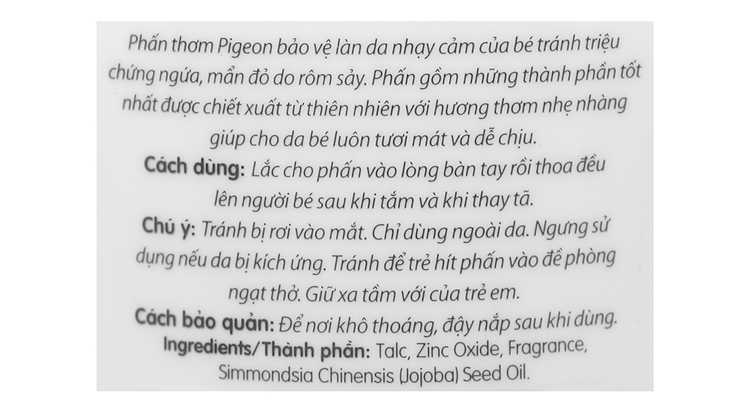 Thành phầnTalc, Oxid kẽm, hương thơm, dầu hạt Simmondsia Chinensis (Jojoba)