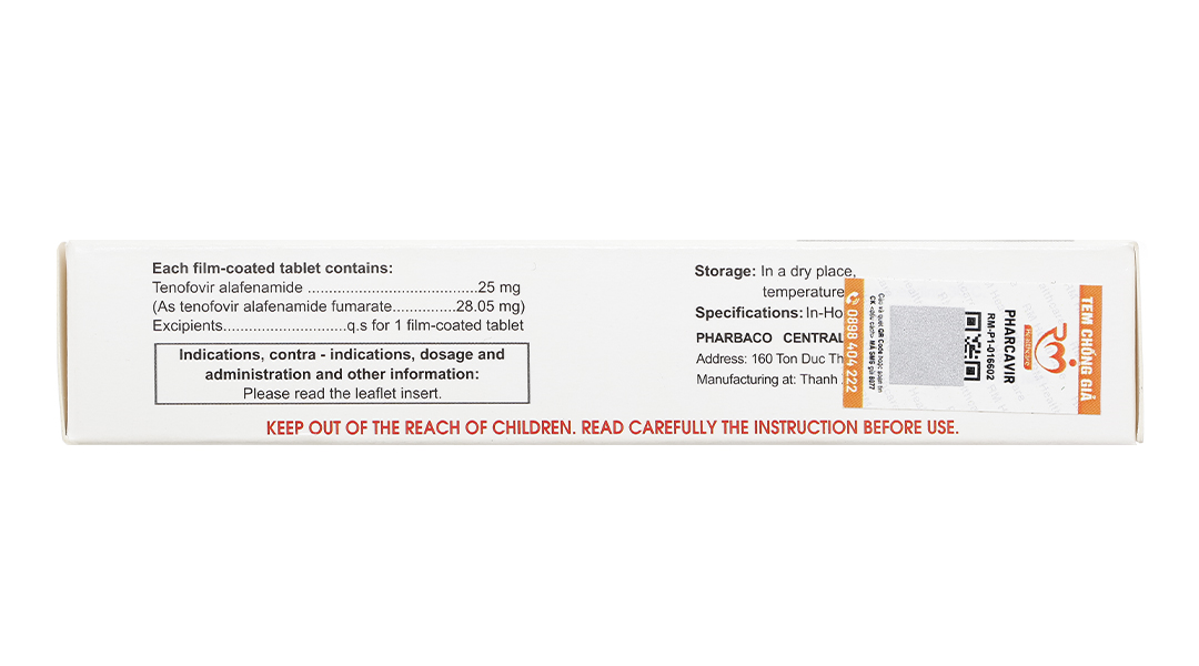 Nồng độ đỉnh trong huyết tương của tenofovir alafenamid đã được quan sát thấy khoảng 0,48 giờ sau khi dùng thuốc vào lúc đói. Nồng độ đỉnh trong huyết tương của tenofovir alafenamid và tenofovir ở trạng thái ổn định lần lượt là 0,18 và 0,02 ug/ml. Dùng một liều đơn Pharcavir cùng với một bữa ăn giàu chất béo làm tăng nồng độ tenofovir alafenamid 65% so với khi uống lúc đói.