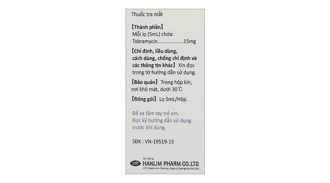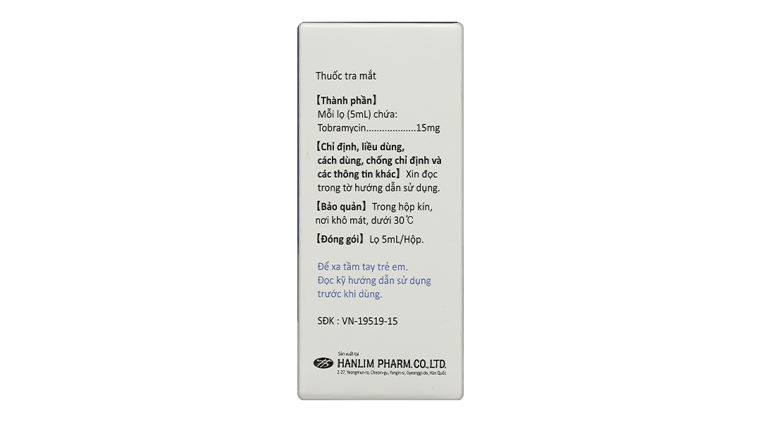 Phụ nữ đang cho con bú: Vì Tobramycin có khả năng gây ra tác dụng phụ trên trẻ đang bú mẹ, do đó tùy thuộc vào tầm quan trọng của thuốc đối với mẹ mà quyết định nên ngưng cho con bú hoặc ngưng dùng thuốc. – Khả năng lái xe và vận hành máy mócCũng như tất cả các loại thuốc nhỏ mắt khác, nếu bệnh nhân bị mờ mắt tạm thời khi mới nhỏ thuốc thì nên đợi khi mắt nhìn thấy rõ lại rồi mới lái xe hoặc vận hành máy móc. – Tương tác thuốcChưa có báo cáo về tương tác của thuốc này với các thuốc khác. |