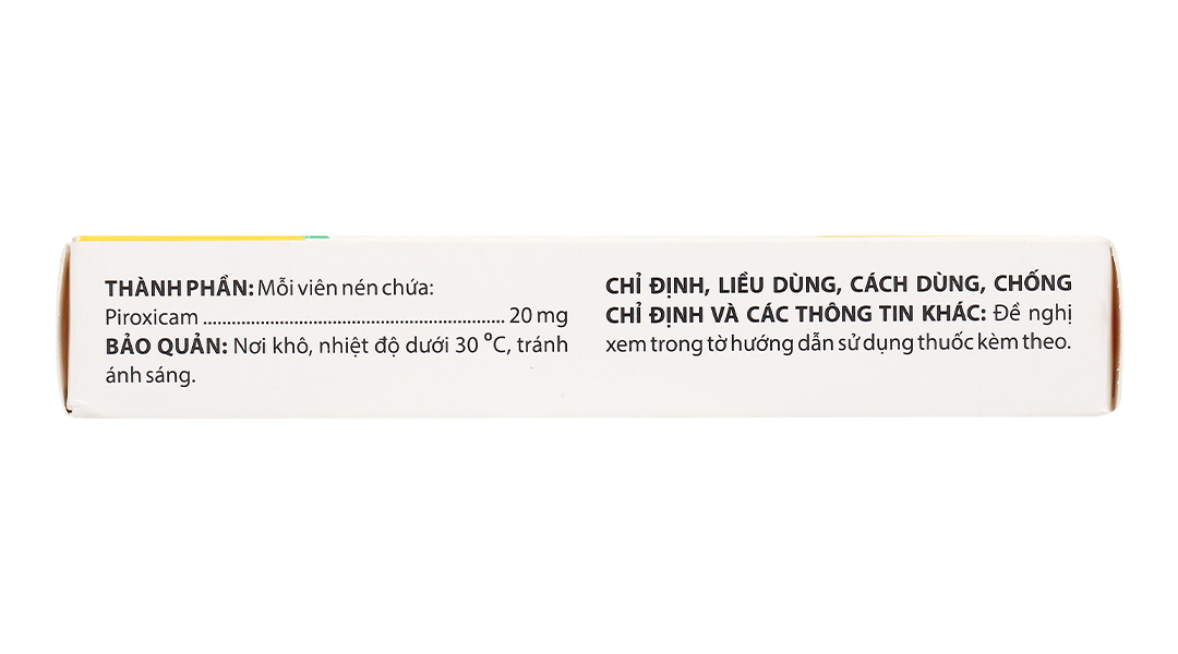– Thận trọng khi sử dụngCác lợi ích và khả năng dung nạp trên lâm sàng nên được đánh giá lại theo định kỳ và ngưng dùng piroxicam ngay lập tức khi xuất hiện phản ứng ở da hoặc vấn đề về tiêu hóa. Tác dụng trên tiêu hóa, nguy cơ loét, chảy máu và thủng dạ dày – tá tràng Các thuốc chống viêm không steroid, bao gồm piroxicam, có thể gây các biến chứng đường tiêu hóa nghiêm trọng bao gồm chảy máu, loét và thủng dạ dày, ruột non hoặc ruột già, có thể gây tử vong. Những tác dụng không mong muốn nghiêm trọng có thể xảy ra bất cứ lúc nào, có hoặc không có các triệu chứng cảnh báo ở những bệnh nhẫn được điều trị bằng thuốc chống viêm không steroid. Dùng thuốc chống viêm không steroid thời gian ngắn và dài đều có nguy cơ làm tăng các biến chứng đường tiêu hóa nghiêm trọng. Bằng chứng từ các nghiên cứu quan sát được cho thấy piroxicam có liên quan đến nguy cơ gây độc đường tiêu hóa nghiêm trọng. Các biến chứng đường tiêu hóa nghiêm trọng: Các đối tượng có nguy cơ cao – Nguy cơ biến chứng đường tiêu hóa nghiêm trọng tăng theo độ tuổi. Bệnh nhân 70 tuổi có nguy cơ cao bị biến chứng. Tránh dùng cho bệnh nhân cao tuổi trên 80 tuổi. – Dùng đồng thời corticosteroid đường uống, các thuốc ức chế chọn lọc tái hấp thu serotonin (SSRIs) hoặc thuốc chống kết tập tiểu cầu như acid acetylsalicylic liều thấp làm tăng nguy cơ gây biến chứng đường tiêu hóa nghiêm trọng. Giống như các thuốc chống viêm không steroid khác, liệu pháp phối hợp với thuốc bảo vệ đường tiêu hóa (ví dụ misoprostol hoặc ức chế bơm proton) cần được xem xét cẩn thận, đặc biệt cho bệnh nhân có nguy cơ cao. – Các biểu hiện và triệu chứng của loét hoặc chảy máu đường tiêu hóa khi dùng piroxicam nên được cảnh báo. Cần thông báo khi có bất kỳ triệu chứng mới hay bất thường ở bụng trong quá trình điều trị với piroxicam. Nếu nghi ngờ biến chứng đường tiêu hóa trong khi điều trị piroxicam, nên ngưng piroxicam ngay lập tức và nên cân nhắc việc đánh giá lâm sàng và điều trị. – Cần theo dõi và tư vấn thích hợp cho bệnh nhân có tiền sử tăng huyết áp và/hoặc suy tim sung huyết nhẹ đến trung bình như giữ nước và phù đã được báo cáo khi dùng piroxicam. – Bệnh nhân tăng huyết áp không kiểm soát, suy tim sung huyết, bệnh tim thiếu máu cục bộ, bệnh động mạch ngoại biên và/hoặc bệnh mạch máu não chỉ nên được điều trị với piroxicam sau khi đánh giá cẩn thận. Việc đánh giá tương tự nên được thực hiện trước khi bắt đầu điều trị lâu dài của bệnh nhân có các yếu tố nguy cơ về biến chứng tim mạch (ví dụ tăng huyết áp, tăng lipid máu, đái tháo đường, hút thuốc lá). – Số liệu dịch tễ học và thử nghiệm lâm sàng cho thấy việc sử dụng một số NSAIDs (đặc biệt ở liều cao và điều trị dài hạn) có thể làm tăng nhẹ nguy cơ huyết khối động mạch (nhồi máu cơ tim hay đột quỵ). Không có dữ liệu loại trừ nguy cơ này do piroxicam. – Thận trọng ở những bệnh nhân đang hoặc có tiền sử bị hen phế quản. – Bệnh nhân đã biết hoặc nghi ngờ có chuyển hóa CYP 2C9 kém dựa trên tiền sử/kinh nghiệm với các chất nền khác của CYP 2C9 nên thận trọng khi dùng piroxicam vì nồng độ của piroxicam cao bất thường do giảm độ thanh thải do chuyển hóa. Phản ứng trên da: – Phản ứng trên da đe dọa tính mạng (hội chứng Stevens-Johnson (SJS) và hoại tử biểu bì gây độc (TEN)) đã được báo cáo khi dùng piroxicam. – Nên thông báo cho bệnh nhẫn những dấu hiệu và triệu chứng và theo dõi chặt chẽ các biểu hiện và triệu chứng các phản ứng trên da. Nguy cơ nặng nhất là sự xuất hiện của hội chứng Stevens-Johnson (SJS) và hoại tử biểu bì gây độc (TEN) trong những tuần đầu điều trị. – Nếu xuất hiện các biểu hiện và triệu chứng của hội chứng Stevens-Johnson (SJS) và hoại tử biểu bì gây độc (TEN) (ví dụ phát ban da tiến triển thường có mụn nước hoặc các tổn thương niêm mạc), nên ngưng dùng piroxicam. – Hiệu quả tốt nhất trong điều trị hội chứng Stevens-Johnson (SJS) và hoại tử biểu bì gây độc (TEN) là chẩn đoán sớm và ngưng ngay lập tức khi có bất kỳ biểu hiện nghi ngờ nào về thuốc. Ngưng dùng piroxicam sớm có liên quan với tiên lượng tốt hơn. – Nếu bệnh nhân đã phát triển hội chứng Stevens-Johnson (SJS) và hoại tử biểu bì gây độc (TEN) khi dùng piroxicam, thì không được dùng lại piroxicam ở bất cứ lúc nào. – Phản ứng da nghiêm trọng, một vài trường hợp có thể tử vong, bao gồm viêm da tróc vảy, hội chứng Stevens-Johnson và hoại tử biểu bì gây độc đã được báo cáo rất hiếm gặp khi dùng piroxicam. Bằng chứng từ các nghiên cứu quan sát cho thấy piroxicam gây ra phản ứng da nghiêm trọng cao hơn các thuốc chống viêm không steroid không thuộc nhóm oxicam khác. Nguy cơ nặng nhất là sự xuất hiện sớm các phản ứng này trong quá trình điều trị, trong đa số các trường hợp thườ