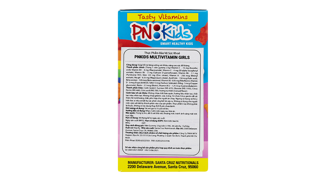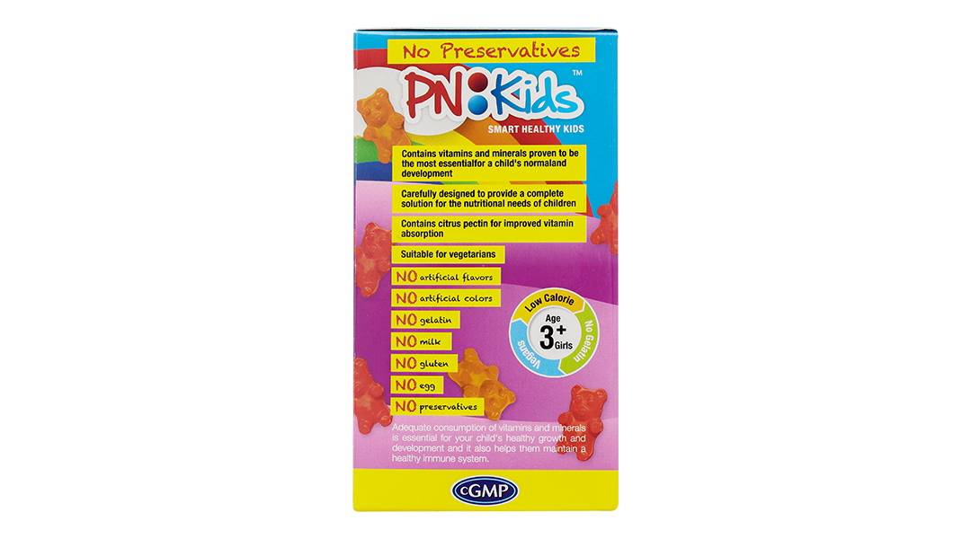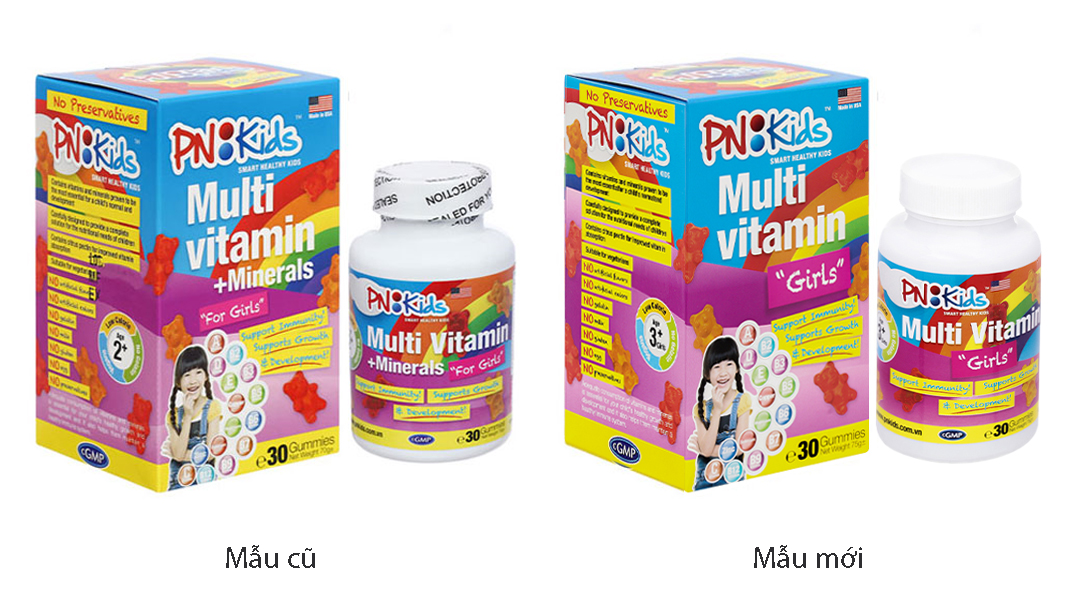 - PN Kids Multi Vitamin Girls là một sản phẩm bổ sung vitamin và khoáng chất dành cho trẻ em gái từ 3 tuổi trở lên, với sự kết hợp giữa các thành phần như Vitamin C, Vitamin A, Vitamin B, Vitamin D, kẽm, magie và biotin, PN Kids Multi Vitamin Girls giúp cung cấp đầy đủ các dưỡng chất thiết yếu cho sự phát triển toàn diện của trẻ. Được sản xuất bởi thương hiệu PN Kids, nổi tiếng trong lĩnh vực thực phẩm bảo vệ sức khỏe cho trẻ em, PN Kids Multi Vitamin Girls mang đến giải pháp dinh dưỡng an toàn và hiệu quả, hỗ trợ sức khỏe của trẻ em mỗi ngày.