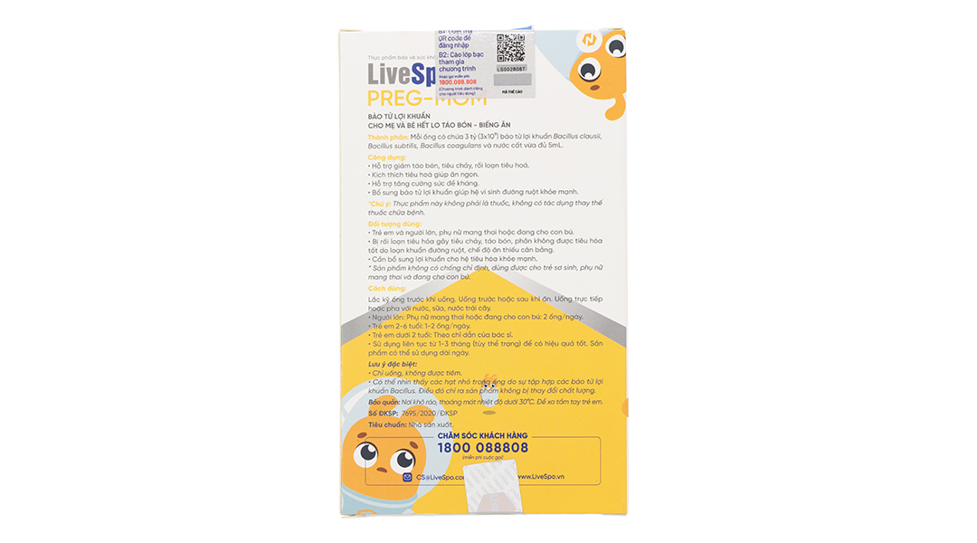 Mỗi ống có chứa 3 tỷ (3 x 109) bào tử lợi khuẩn Bacillus clausii, Bacillus subtilis, Bacillus Coagulans và Nước cất vừa đủ 5ml.