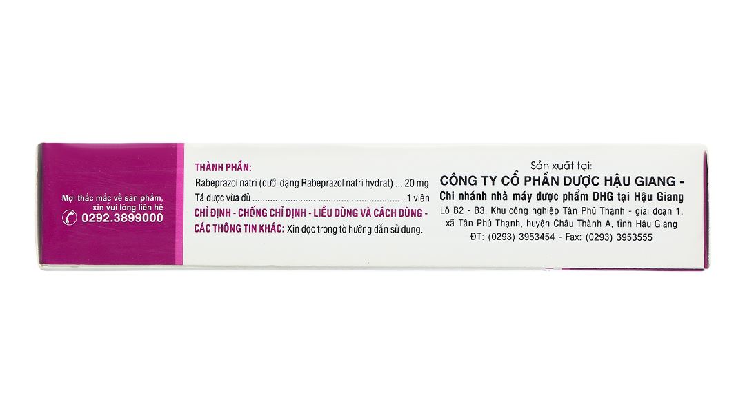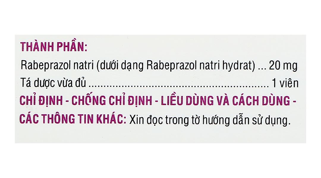 Dược chất: Rabeprazol natri (dưới dạng Rabeprazol natri hydrat) 20mg.