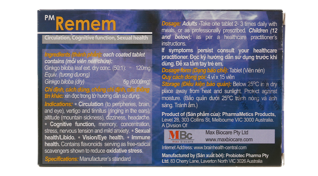 - Ginkgo biloba leaf ext. dry conc. (50:1) 120mg, tương đương với Ginkgo biloba dry 6g (6000mg).