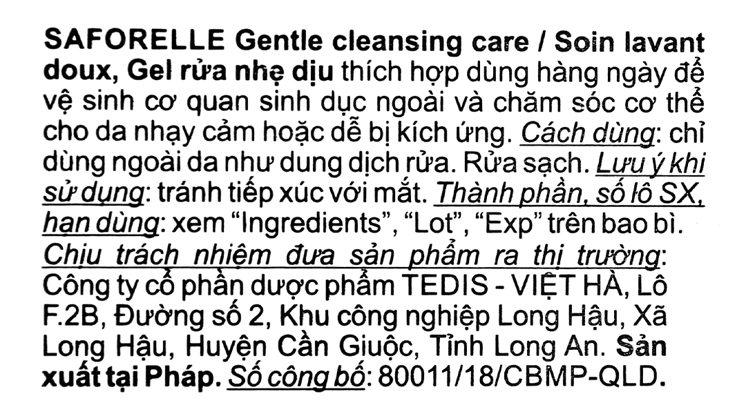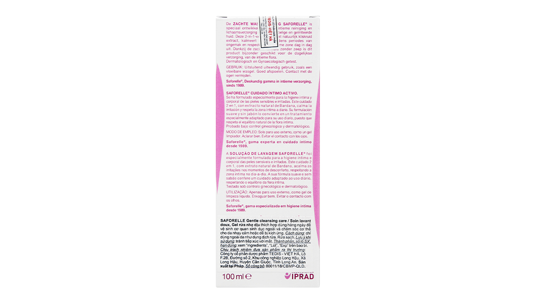 Dung dịch vệ sinh phụ nữ Saforelle với thành phần thiên nhiên chiết xuất từ cây ngưu bàng có tác dụng kháng viêm, làm dịu và làm giảm kích ứng cho da, giữ da luôn mềm mại và sạch khỏe, không ngứa rát tạo cảm giác khó chịu. Dung dịch vệ sinh phụ nữ là sản phẩm chăm sóc cá nhân không thể thiếu của chị em phụ nữ để làm sạch vùng kín, khử mùi hôi khó chịu và ngăn ngừa nguy cơ viêm nhiễm.